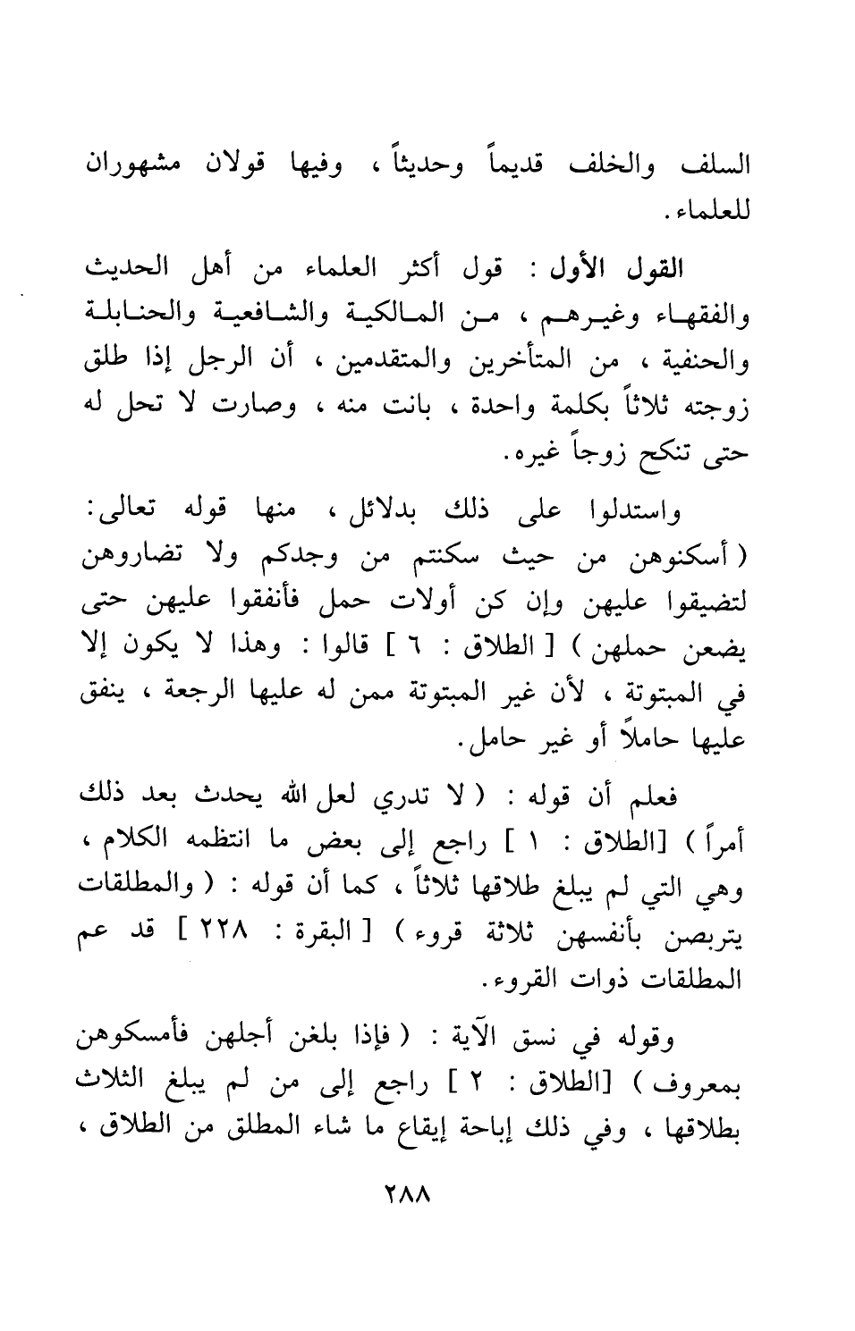 واستدلوا على ذلك بدلائل، منها قوله تعالى: {أَسْكِنُوهُنَّ مِنْ حَيْثُ سَكَنْتُمْ مِنْ وُجْدِكُمْ وَلا تُضَارُّوهُنَّ لِتُضَيِّقُوا عَلَيْهِنَّ وَإِنْ كُنَّ أُولاتِ حَمْلٍ فَأَنْفِقُوا عَلَيْهِنَّ حَتَّى يَضَعْنَ حَمْلَهُنَّ} [سورة الطلاق آية: 6] ، قالوا: وهذا لا يكون إلا في المبتوتة، لأن غير المبتوتة ممن له عليها الرجعة، ينفق عليها حاملاً أو غير حام؛. فعلم أن قوله: {لا تَدْرِي لَعَلَّ اللَّهَ يُحْدِثُ بَعْدَ ذَلِكَ أَمْراً} [سورة الطلاق آية: 1] راجع إلى بعض ما انتظمه الكلام، وهي التي لم يبلغ طلاقها ثلاثاً، كما أن قوله: {وَالْمُطَلَّقَاتُ يَتَرَبَّصْنَ بِأَنْفُسِهِنَّ ثَلاثَةَ قُرُوءٍ} [سورة البقرة آية: 228] قد عم المطلقات ذوات القروء.