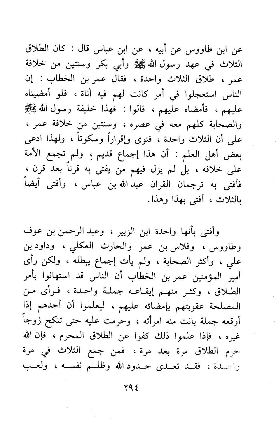 عن ابن طاووس عن أبيه عن ابن عباس قال: "كان الطلاق الثلاث في عهد رسول الله صلى الله عليه وسلم وأبي بكر وسنتين من خلافة عمر، طلاق الثلاث واحدة، فقال عمر بن الخطاب: إن الناس استعجلوا في أمر كانت لهم فيه أناة، فلو أمضيناه عليهم. فأمضاه عليهم"، قالوا: فهذا خليفة رسول الله صلى الله عليه وسلم والصحابة كلهم معه في عصره، وسنتين من خلافة عمر، على أن الثلاث واحدة، فتوى وإقراراً وسكوتاً، ولهذا ادعى بعض أهل العلم: أن هذا إجماع قديم، ولم تجمع الأمة على خلافه، بل لم يزل فيهم من يفتى به قرناً بعد قرن؛ فأفتى به ترجمان القرآن عبد الله بن عباس، وأفتى أيضاً بالثلاث، أفتى بهذا وهذا.