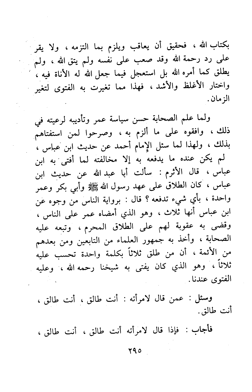 ولما علم الصحابة حسن سياسة عمر وتأديبه لرعيته في ذلك، وافقوه على ما ألزم به، وصرحوا لمن استفتاهم بذلك؛ ولهذا لما سئل الإمام أحمد عن حديث ابن عباس، لم يكن عنده ما يدفعه به إلا مخالفته لما أفتى به ابن عباس. قال الأثرم: سألت أبا عبد الله عن حديث ابن عباس: "كان الطلاق على عهد رسول الله صلى الله عليه وسلم وأبي بكر وعمر واحدة"، بأي شيء تدفعه؟ قال: برواية الناس من وجوه عن ابن عباس أنها ثلاث، وهو الذي أمضاه عمر على الناس، وقضى به عقوبة لهم على الطلاق المحرم، وتبعه عليه الصحابة، وأخذ به جمهور العلماء من التابعين ومن بعدهم من الأئمة، أن من طلق ثلاثاً بكلمة واحدة تحسب عليه ثلاثاً. وهو الذي كان يفتي به شيخنا، رحمه الله، وعليه الفتوى عندنا.