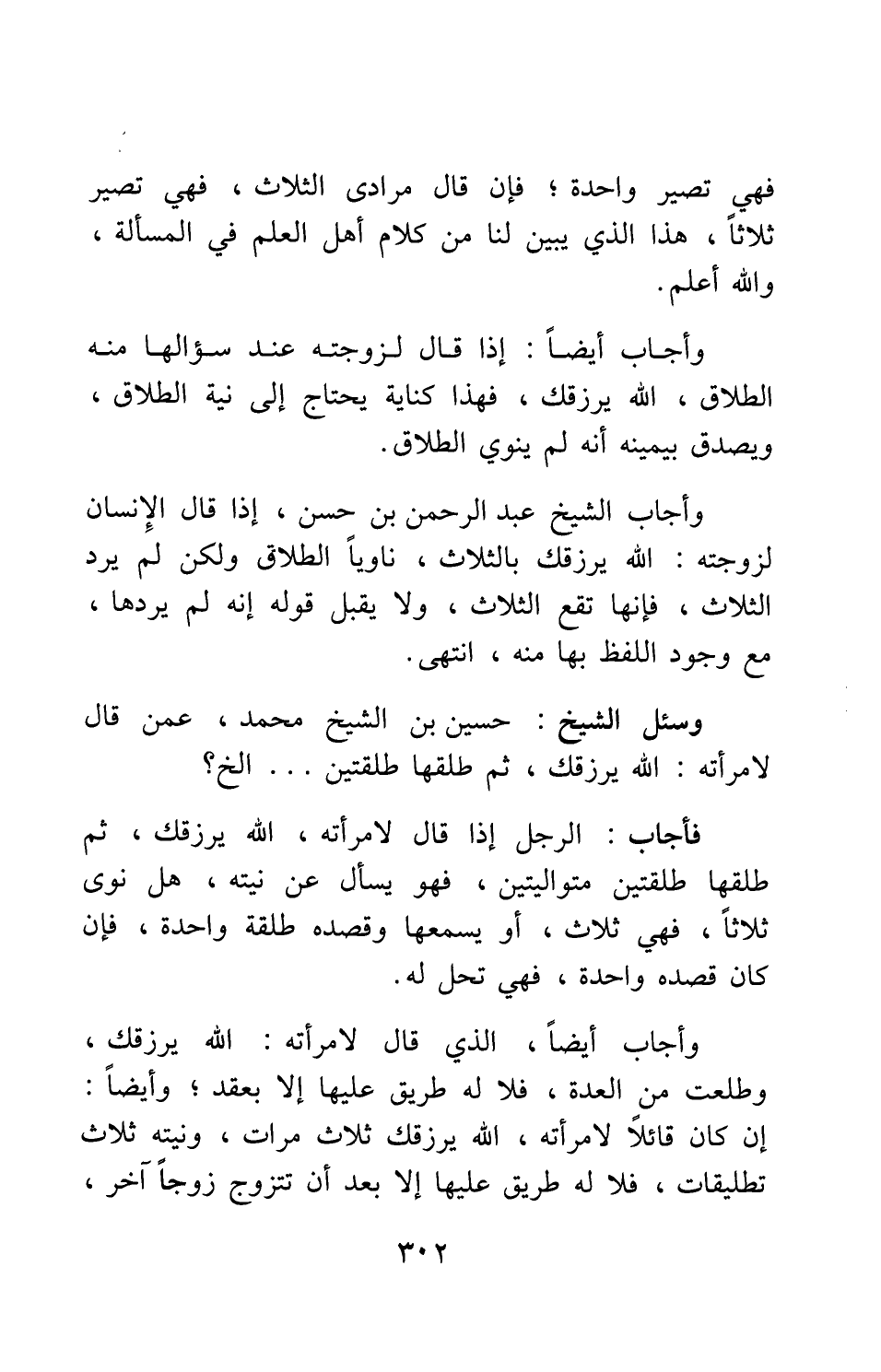 وأجاب الشيخ عبد الرحمن بن حسن: إذا قال الإنسان لزوجته: الله يرزقك بالثلاث، ناوياً الطلاق، ولكن لم يرد الثلاث، فإنها تقع الثلاث، ولا يقبل قوله إنه لم يردها، مع وجود اللفظ بها منه. انتهى.