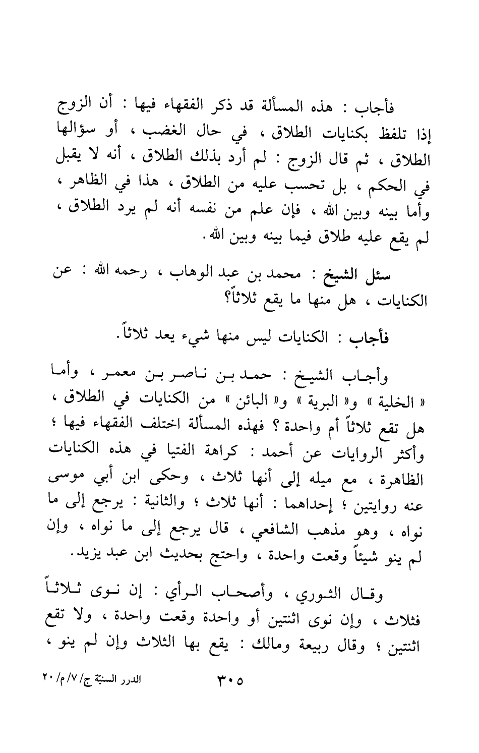 سئل الشيخ محمد بن عبد الوهاب، رحمه الله: عن الكنايات، هل منها ما يقع ثلاثاً؟