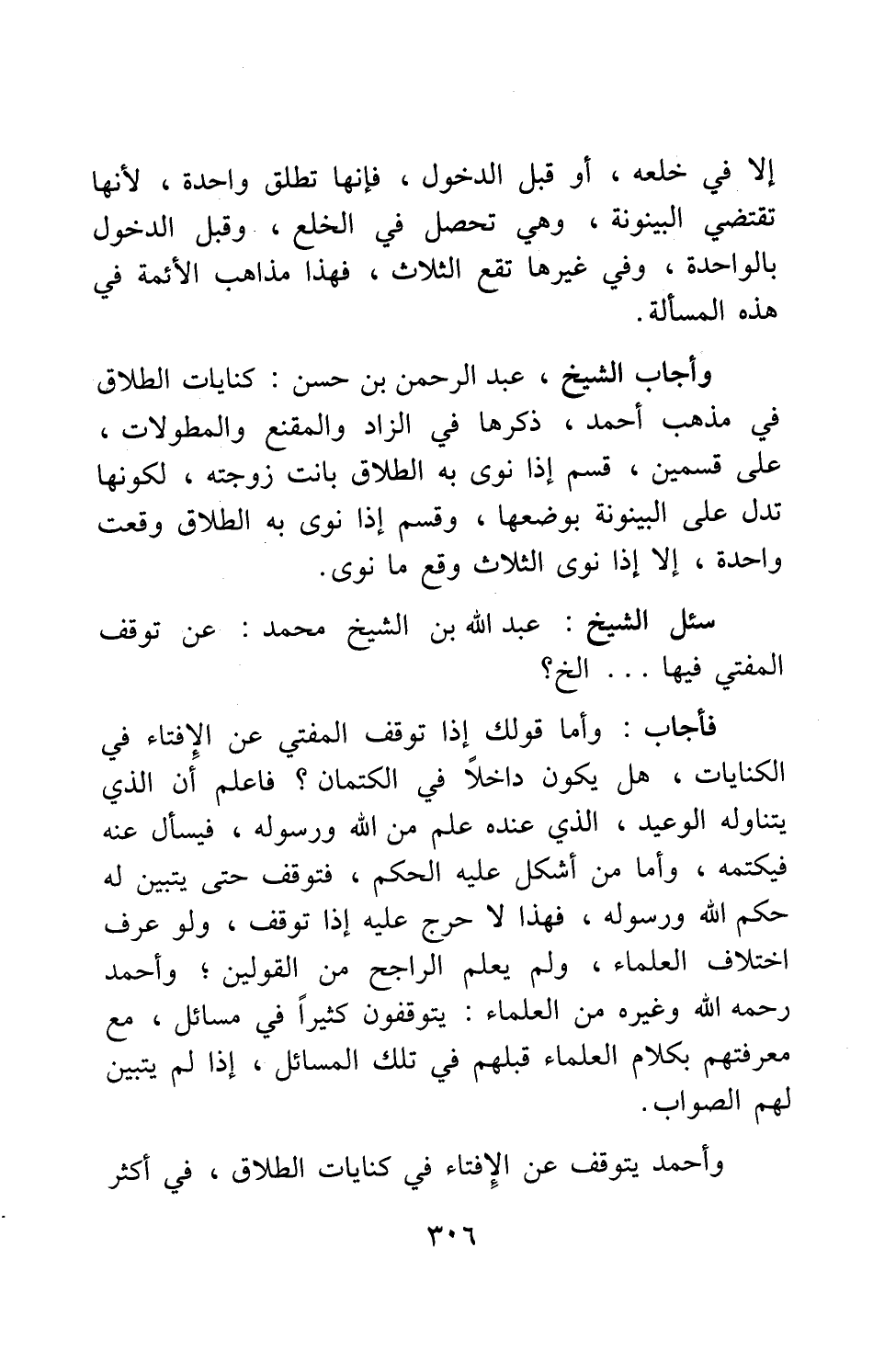 وأجاب الشيخ عبد الرحمن بن حسن: كنايات الطلاق في مذهب أحمد، ذكرها في الزاد والمقنع والمطولات، على قسمين: قسم إذا نوى به الطلاق بانت زوجته، لكونها تدل على البينونة بوضعها، وقسم إذا نوى به الطلاق وقعت واحدة، إلا إذا نوى الثلاث وقع ما نوى.