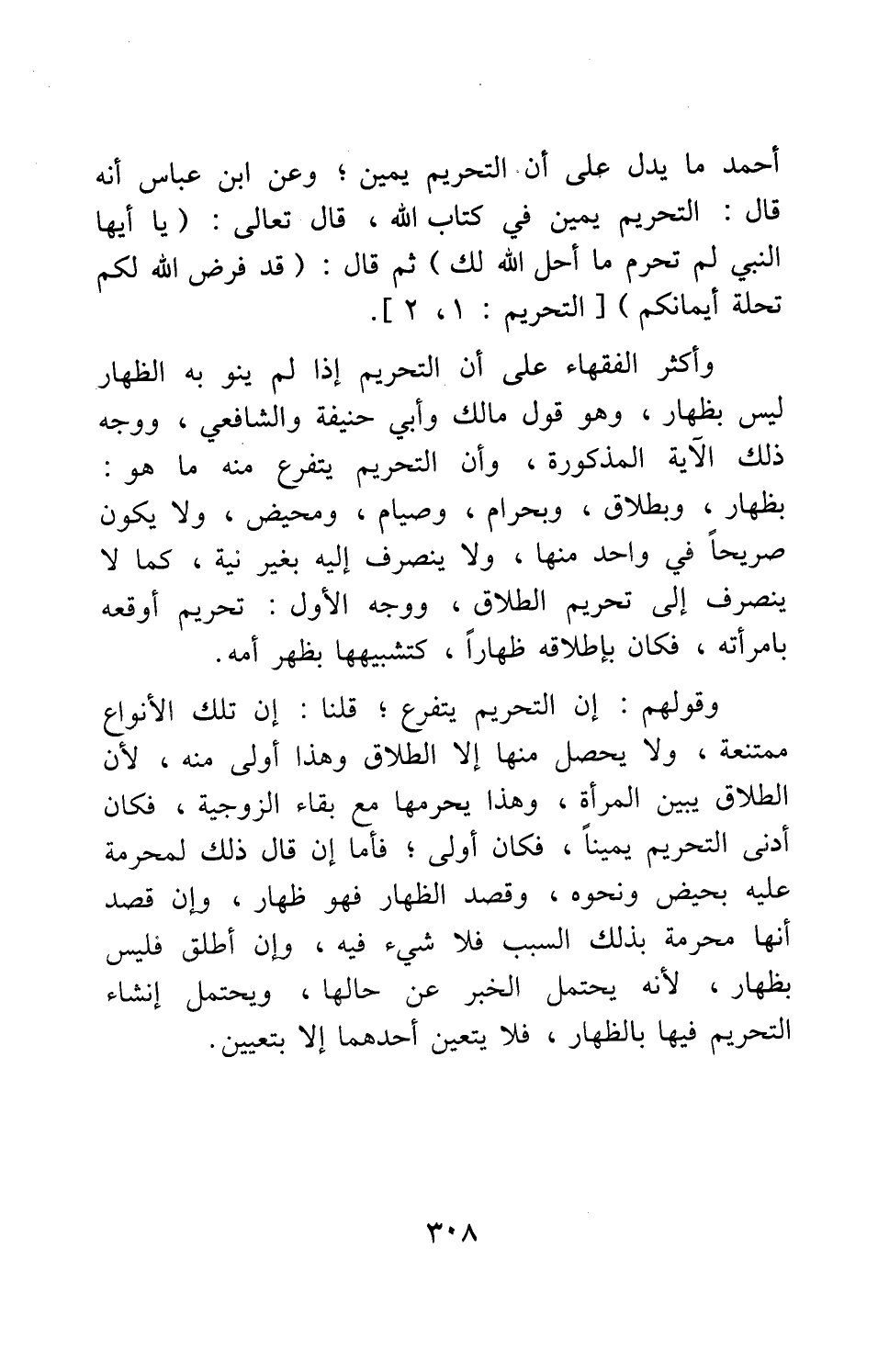 وأكثر الفقهاء على أن التحريم إذا لم ينو به الظهار ليس بظهار، وهو قول مالك وأبي حنيفة والشافعي؛ ووجه ذلك: الآية المذكورة، وأن التحريم يتفرع منه ما هو: بظهار، وبطلاق، وبحرام، وصيام، ومحيض، ولا يكون صريحاً في واحد منها، ولا ينصرف إليه بغير نية، كما لا ينصرف إلى تحريم الطلاق. ووجه الأول: تحريم أوقعه بامرأته، فكان بإطلاقه ظهاراً، كتشبيهها بظهر أمه.