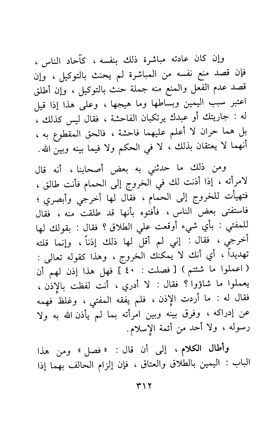 ومن ذلك ما حدثني به بعض أصحابنا، أنه قال لامرأته: إذا أذنت لك في الخروج إلى الحمام فأنت طالق، فتهيأت للخروج إلى الحمام، فقال لها: اخرجي وأبصري. فاستفتى بعض الناس، فأفتوه بأنها قد طلقت منه، فقال للمفتي: بأي شيء أوقعت علي الطلاق؟ فقال: بقولك لها اخرجي، فقال: إني لم أقل لها ذلك إذناً، وإنما قلته تهديداً، أي: أنك لا يمكنك الخروج، وهذا كقوله تعالى: {اعْمَلُوا مَا شِئْتُمْ} [سورة فصلت آية: 40] ، فهل هذا إِذْنٌ لهم أن يعملوا ما شاؤوا؟ فقال: لا أدري، أنت لفظت بالإذن، فقال له: ما أردت الإذن، فلم يفقه المفتي، وغلظ فهمه عن إدراكه، وفرق بينه وبين امرأته بما لم يأذن الله به ولا رسوله، ولا أحد من أئمة الإسلام.
