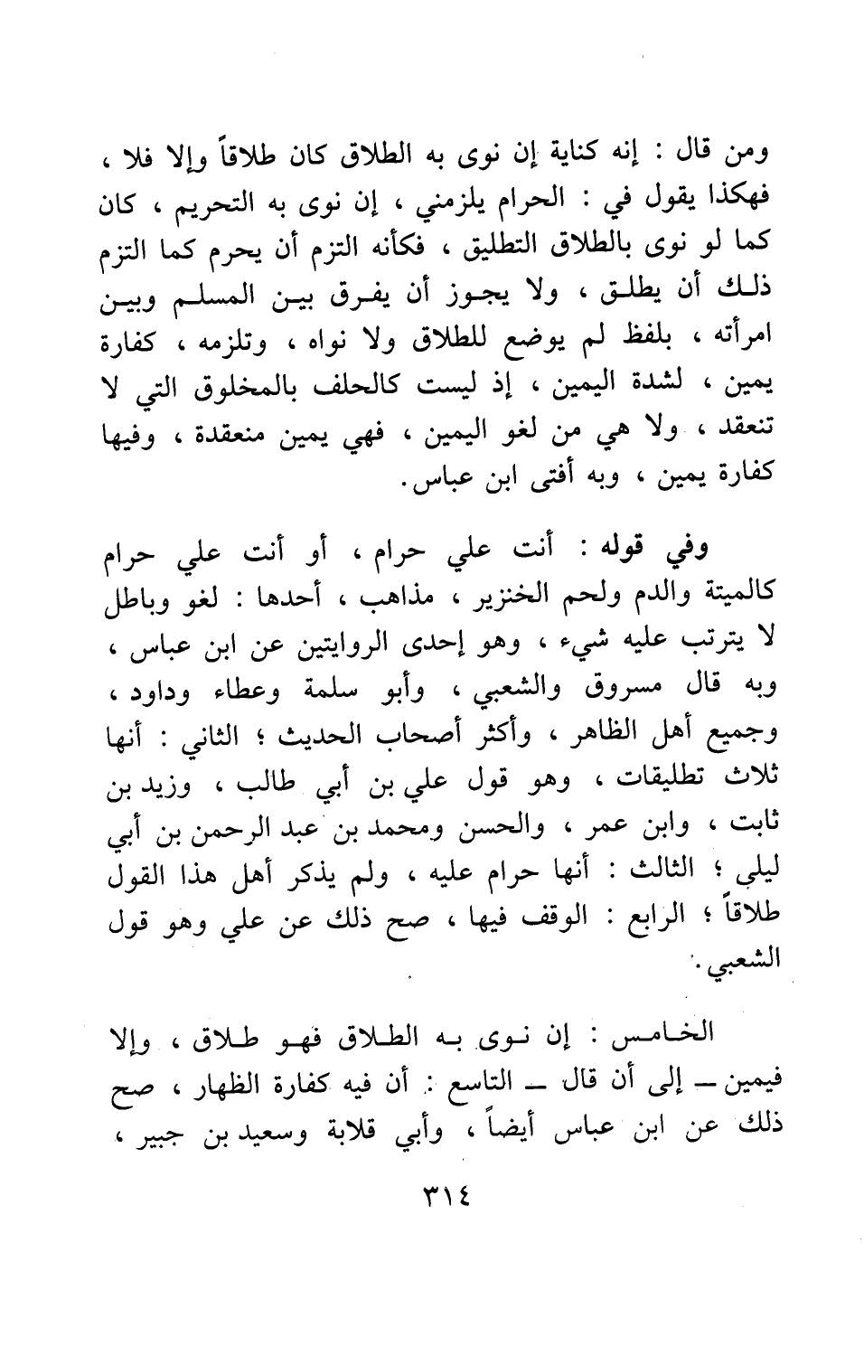 ومن قال: إنه كناية، إن نوى به الطلاق كان طلاقاً وإلا فلا؛ فهكذا يقول في: الحرام يلزمني، إن نوى به التحريم كان كما لو نوى بالطلاق التطليق، فكأنه التزم أن يحرم كما التزم ذلك أن يطلق. ولا يجوز أن يفرق بين المسلم وبين امرأته بلفظ لم يوضع للطلاق، ولا نواه، وتلزمه كفارة يمين لشدة اليمين، إذ ليست كالحلف بالمخلوق التي لا تنعقد، ولا هي من لغو اليمين، فهي يمين منعقدة، وفيها كفارة يمين؛ وبه أفتى ابن عباس.