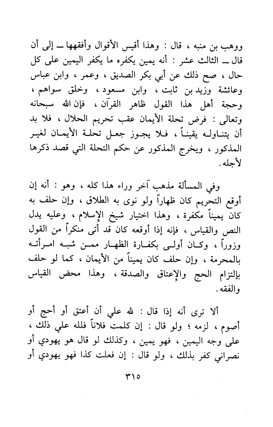 الثالث عشر: أنه يمين يكفره ما يكفر اليمين على كل حال، صح ذلك عن أبي بكر الصديق، وعمر، وابن عباس وعائشة وزيد بن ثابت، وابن مسعود، وخلق سواهم؛ وحجة أهل هذا القول: ظاهر القرآن، فإن الله سبحانه وتعالى فرض تحلة الأيمان عقب تحريم الحلال، فلا بد أن يتناوله يقيناً، فلا يجوز جعل تحلة الأيمان لغير المذكور، ويخرج المذكور عن حكم التحلة التي قصد ذكرها لأجله.