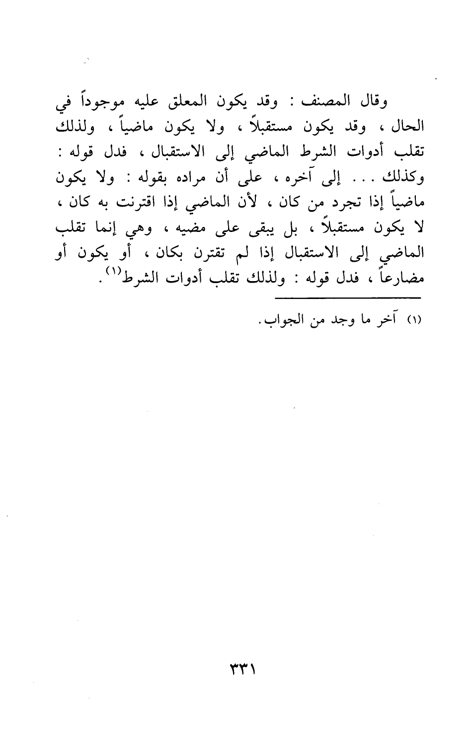 وقال المصنف: وقد يكون المعلق عليه موجوداً في الحال، وقد يكون مستقبلاً، ولا يكون ماضياً، ولذلك تقلب أدوات الشرط الماضي إلى الاستقبال، فدل قوله: وكذلك ... إلخ، على أن مراده بقوله: ولا يكون ماضياً إذا تجرد من كان، لأن الماضي إذا اقترنت به كان، لا يكون مستقبلاً، بل يبقى على مضيه، وهي إنما تقلب الماضي إلى الاستقبال إذا لم تقترن بكان، أو يكون أو مضارعاً، فدل قوله: ولذلك تقلب أدوات الشرط 1.