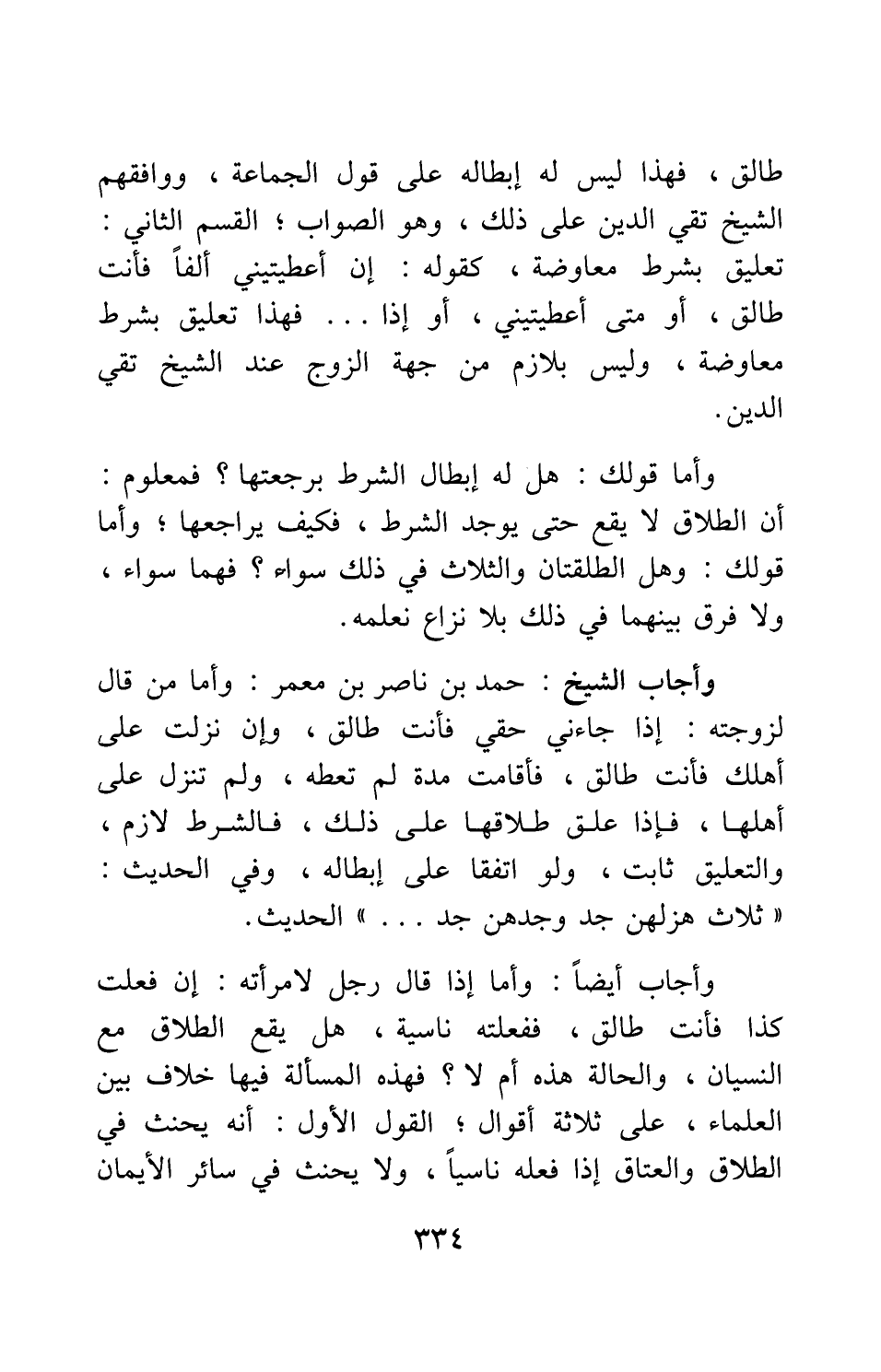 وأجاب الشيخ حمد بن ناصر بن معمر: وأما من قال لزوجته: إذا جاءني حقي فأنت طالق، وإن نزلت على أهلك فأنت طالق، فأقامت مدة لم تعطه، ولم تنزل على أهلها، فإذا علق طلاقها على ذلك، فالشرط لازم، والتعليق ثابت، ولو اتفقا على إبطاله، وفي الحديث: " ثلاث هزلهن جد وجدهن جد ... " 1 الحديث.