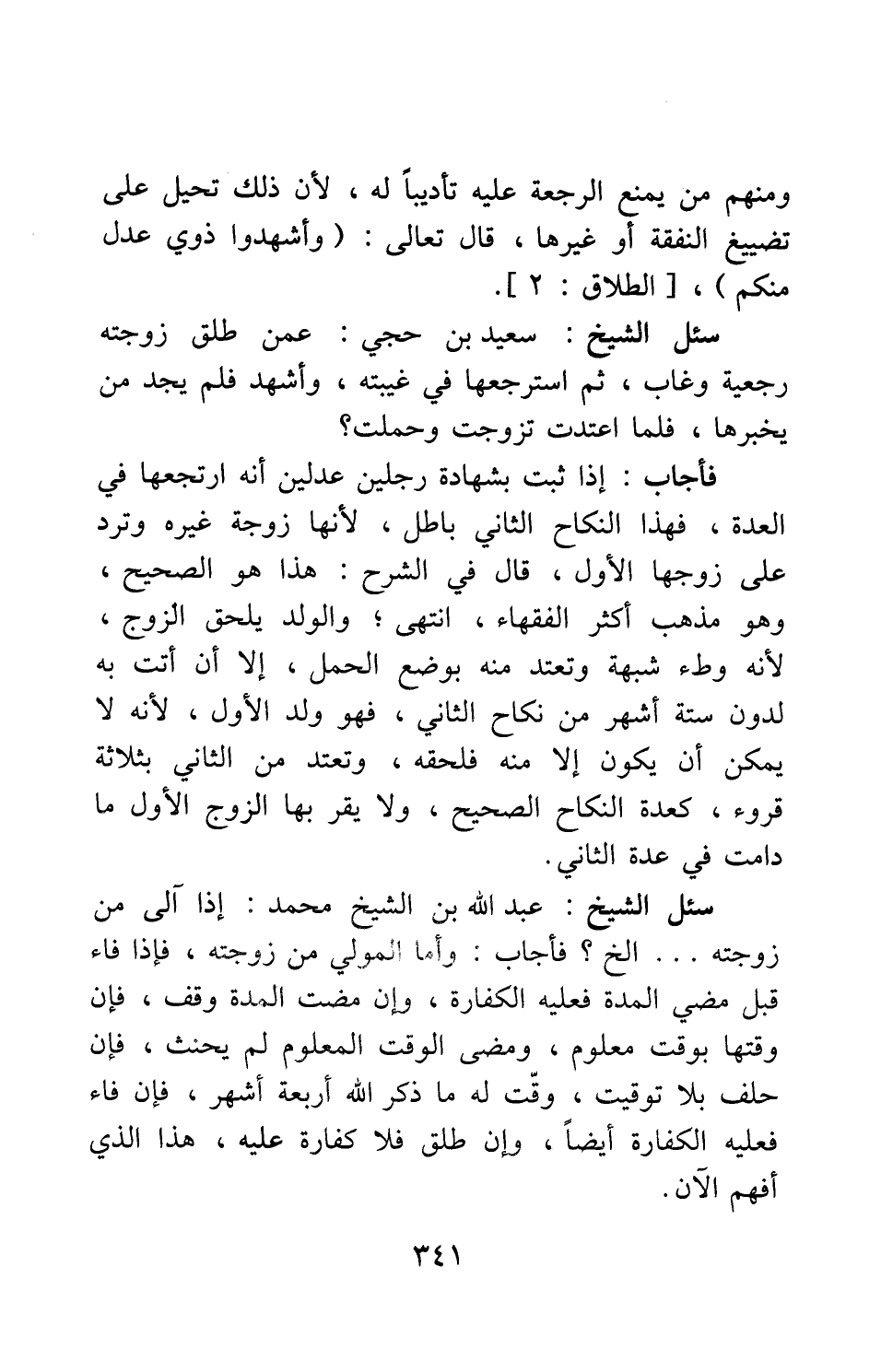 فأجاب: إذا ثبت بشهادة رجلين عدلين أنه ارتجعها في العدة، فهذا النكاح الثاني باطل، لأنها زوجة غيره وترد على زوجها الأول؛ قال في الشرح: هذا هو الصحيح، وهو مذهب أكثر الفقهاء. انتهى. والولد يلحق الزوج، لأنه وطء شبهة، وتعتد منه بوضع الحمل، إلا إن أتت به لدون ستة أشهر من نكاح الثاني، فهو ولد الأول، لأنه لا يمكن أن يكون إلا منه فلحقه، وتعتد من الثاني بثلاثة قروء، كعدة النكاح الصحيح، ولا يقربها الزوج الأول ما دامت في عدة الثاني.