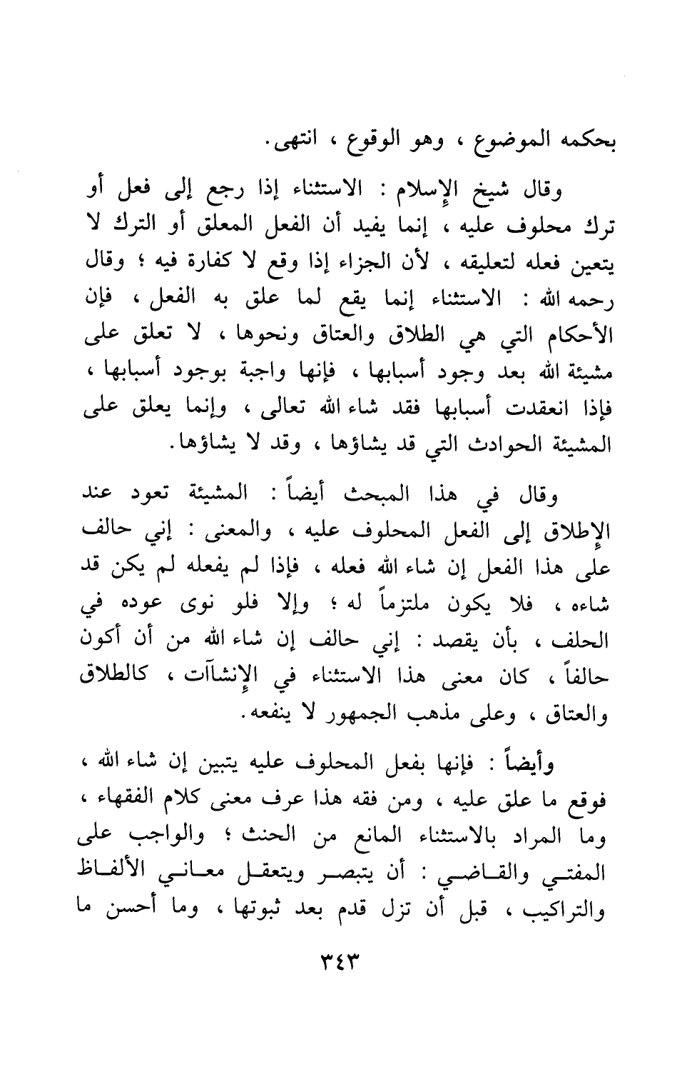 وقال شيخ الإسلام: الاستثئاء إذا رجع إلى فعل أو ترك محلوف عليه، إنما يفيد أن الفعل المعلق أو الترك لا يتعين فعله لتعليقه، لأن الجزاء إذا وقع لا كفارة فيه; وقال رحمه الله: الاستثناء إنما يقع لما علق به الفعل، فإن الأحكام التي هي الطلاق والعتاق ونحوها، لا تعلق على مشيئة الله بعد وجود أسبابها، فإنها واجبه بوجود أسبابها، فإذا انعقدت أسبابها فقد شاء الله تعالى، وإنما يعلق على المشيئة الحوادث التي قد يشاؤها، وقد لا يشاؤها. وقال في هذا المبحث أيضاً: المشيئة تعود عند الإطلاق إلى الفعل المحلوف عليه، والمعنى: إني حالف على هذا الفعل إن شاء الله فعله، فإذا لم يفعله لم يكن قد شاءه، فلا يكون ملتزماً له، وإلا فلو نوى عوده في الحلف، بأن يقصد: إني حالف إن شاء الله من أن أكون حالفاً، كان معنى هذا الاستثناء في الإنشاءات، كالطلاق والعتاق، وعلى مذهب الجمهور لا ينفعه. وأيضاً، فإنها بفعل المحلوف عليه يتبين إن شاء الله، فوقع ما علق عليه. ومن فقه هذا، عرف معنى كلام الفقهاء، وما المراد بالاستثناء المانع من الحنث; والواجب على المفتي والقاضي: أن يتبصر ويتعقل معاني الألفاظ والتراكيب، قبل أن تزل قدم بعد ثبوتها، وما أحسن ما