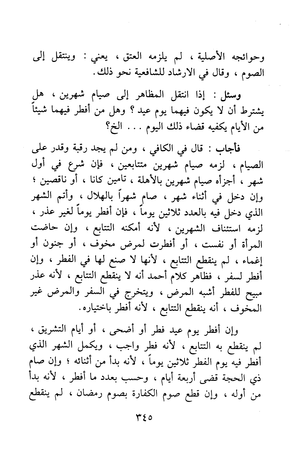 فأجاب: قال في الكافي: ومن لم يجد رقبة وقدر على الصيام، لزمه صيام شهرين متتابعين؛ فإن شرع في أول شهر، أجزأه صيام شهرين بالأهلة، تامين كانا أو ناقصين. وإن دخل في أثناء شهر، صام شهراً بالهلال، وأتم الشهر الذي دخل فيه بالعدد ثلاثين يوماً؛ فإن أفطر يوما لغير عذر، لزمه استئناف الشهرين، لأنه أمكنه التتابع. وإن حاضت المرأة أو نفست، أو أفطرت لمرض مخوف، أو جنون أو إغماء، لم ينقطع التتابع، لأنها لا صنع لها في الفطر. وإن أفطر لسفر، فظاهر كلام أحمد أنه لا ينقطع التتابع، لأنه عذر مبيح للفطر أشبه المرض؛ ويتخرج في السفر والمرض غير المخوف، أنه ينقطع التتابع، لأنه أفطر باختياره.
