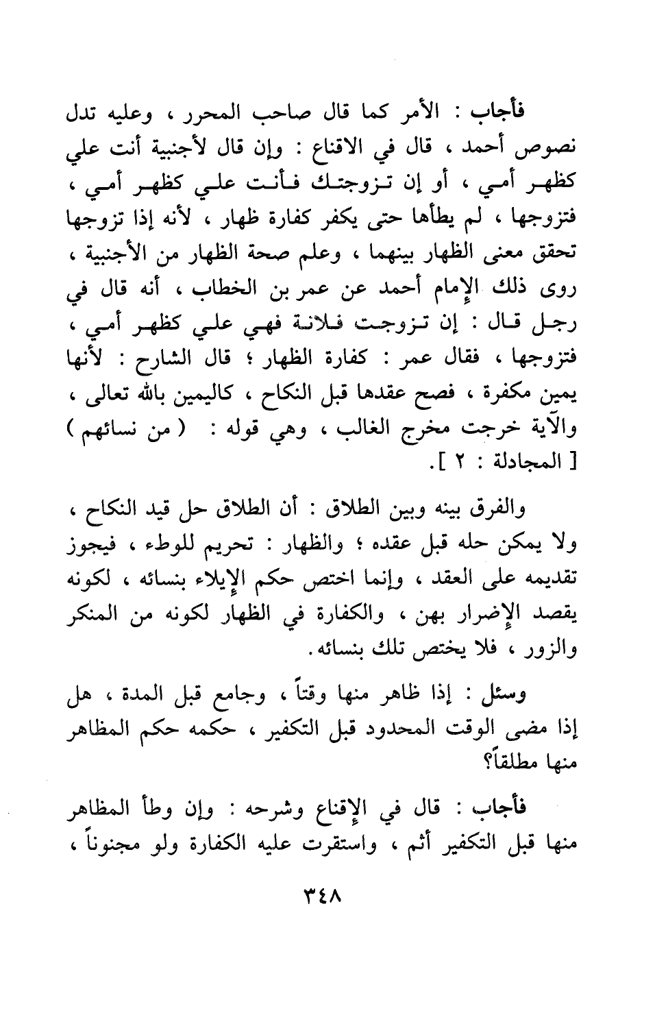 فأجاب: الأمر كما قال صاحب المحرر، وعليه تدل نصوص أحمد، قال في الإقناع: وإن قال لأجنبية: أنت علي كظهر أمي، أو إن تزوجتك فأنت علي كظهر أمي، فتزوجها، لم يطأها حتى يكفِّر كفارة ظهار، لأنه إذا تزوجها تحقق معنى الظهار بينهما. وعلم صحة الظهار من الأجنبية روى ذلك الإمام أحمد عن عمر بن الخطاب، أنه قال في رجل قال: "إن تزوجت فلانة فهي علي كظهر أمي، فتزوجها، فقال عمر: كفارة الظهار" قال الشارح: لأنها يمين مكفرة، فصح عقدها قبل النكاح، كاليمين بالله تعالى، والآيات خرجت مخرج الغالب، وهي قوله: {مِنْ نِسَائِهِمْ} [المجادلة: 2] .