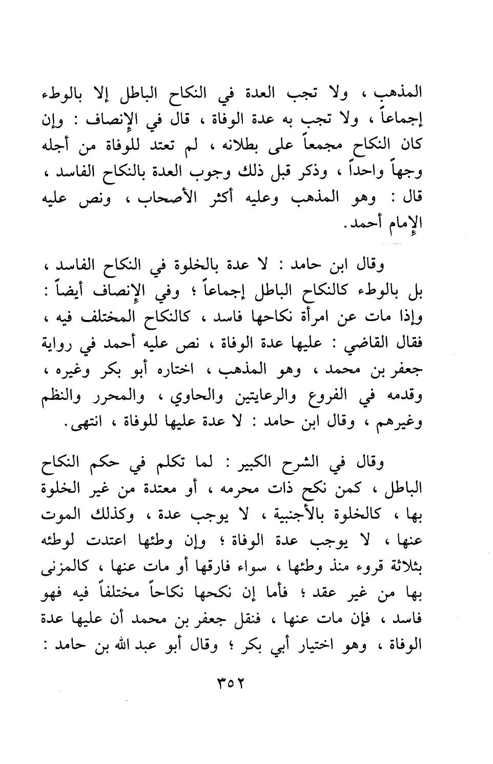 وقال ابن حامد: لا عدة بالخلوة في النكاح الفاسد، بل بالوطء كالنكاح الباطل إجماعاً; وفي الإنصاف أيضاً: وإذا مات عن امرأة نكاحها فاسد، كالنكاح المختلف فيه، فقال القاضي: عليها عدة الوفاة، نص عليه أحمد في رواية جعفر بن محمد، وهو المذهب، اختاره أبو بكر وغيره، وقدمه في الفروع والرعايتين والحاوي، والمحرر والنظم وغيرهم. وقال ابن حامد: لا عدة عليها للوفاة. انتهى.