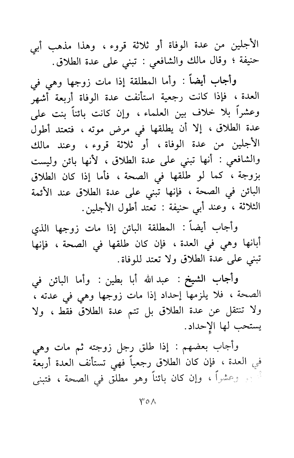 وأجاب أيضاً: وأما المطلقة إذا مات زوجها وهي في العدة، فإذا كانت رجعية استأنفت عدة الوفاة أربعة أشهر وعشراً بلا خلاف بين العلماء، وإن كانت بائناً بنت على عدة الطلاق، إلا أن يطلقها في مرض موته، فتعتد أطول الأجلين من عدة الوفاة، أو ثلاثة قروء. وعند مالك والشافعي: أنها تبني على عدة الطلاق، لأنها بائن وليست بزوجة، كما لو طلقها في الصحة. فأما إذا كان الطلاق البائن في الصحة، فإنها تبني على عدة الطلاق عند الأئمة الثلاثة، وعند أبي حنيفة: تعتد أطول الأجلين.