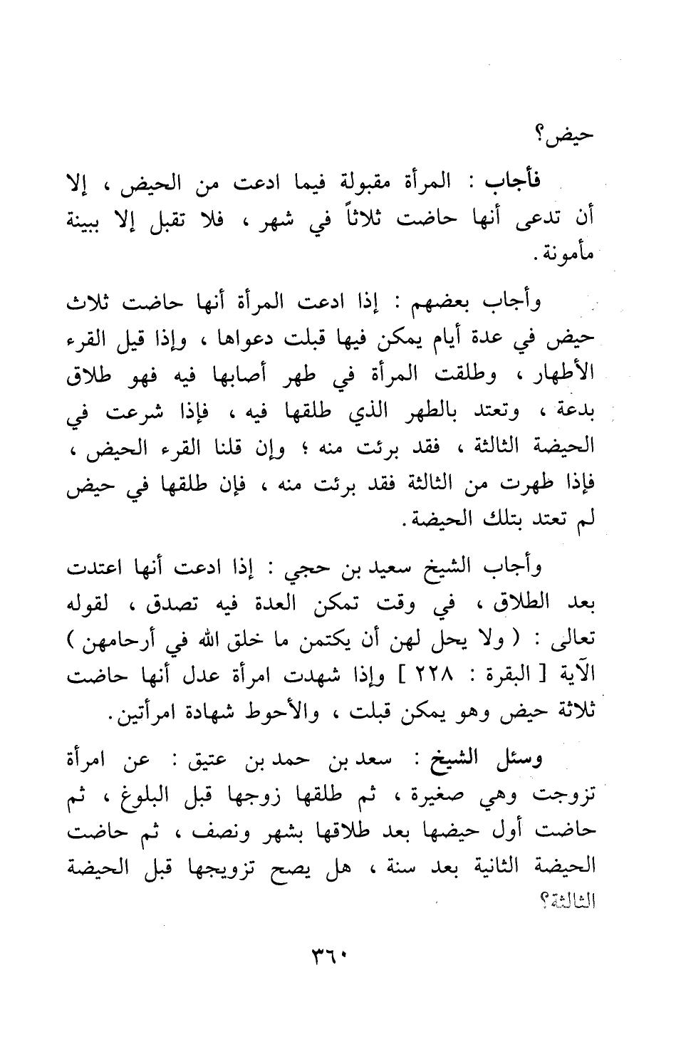 وأجاب الشيخ سعيد بن حجي: إذا ادعت أنها اعتدت بعد الطلاق، في وقت تمكن العدة فيه تُصَدَّق، لقوله تعالى: {وَلا يَحِلُّ لَهُنَّ أَنْ يَكْتُمْنَ مَا خَلَقَ اللَّهُ فِي أَرْحَامِهِنَّ} الآية [سورة البقرة آية: 228] . وإذا شهدت امرأة عدل أنها حاضت ثلاث حيض وهو يمكن، قُبِلَت؛ والأحوط شهادة امرأتين.