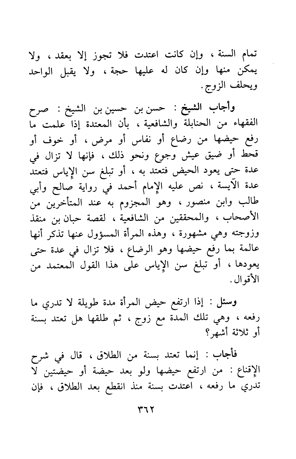 وأجاب الشيخ حسن بن حسين بن الشيخ: صرح الفقهاء من الحنابلة والشافعية: بأن المعتدة إذا علمت ما رَفَعَ حيضها من رضاع أو نفاس أو مرض، أو خوف أو قحط أو ضيق عيش وجوع ونحو ذلك، فإنها لا تزال في عدة حتى يعود الحيض فتعتد به، أو تبلغ سن الإياس فتعتد عدة الآيسة؛ نص عليه الإمام أحمد في رواية صالح وأبي طالب وابن منصور، وهو المجزوم به عند المتأخرين من الأصحاب، والمحققين من الشافعية، لقصة حبان بن منقذ وزوجته وهي مشهورة. وهذه المرأة المسؤول عنها، تذكر أنها عالمة بما رفع حيضها وهو الرضاع، فلا تزال في عدة حتى يعودها، أو تبلغ سن الإياس، على هذا القول المعتمد من الأقوال.