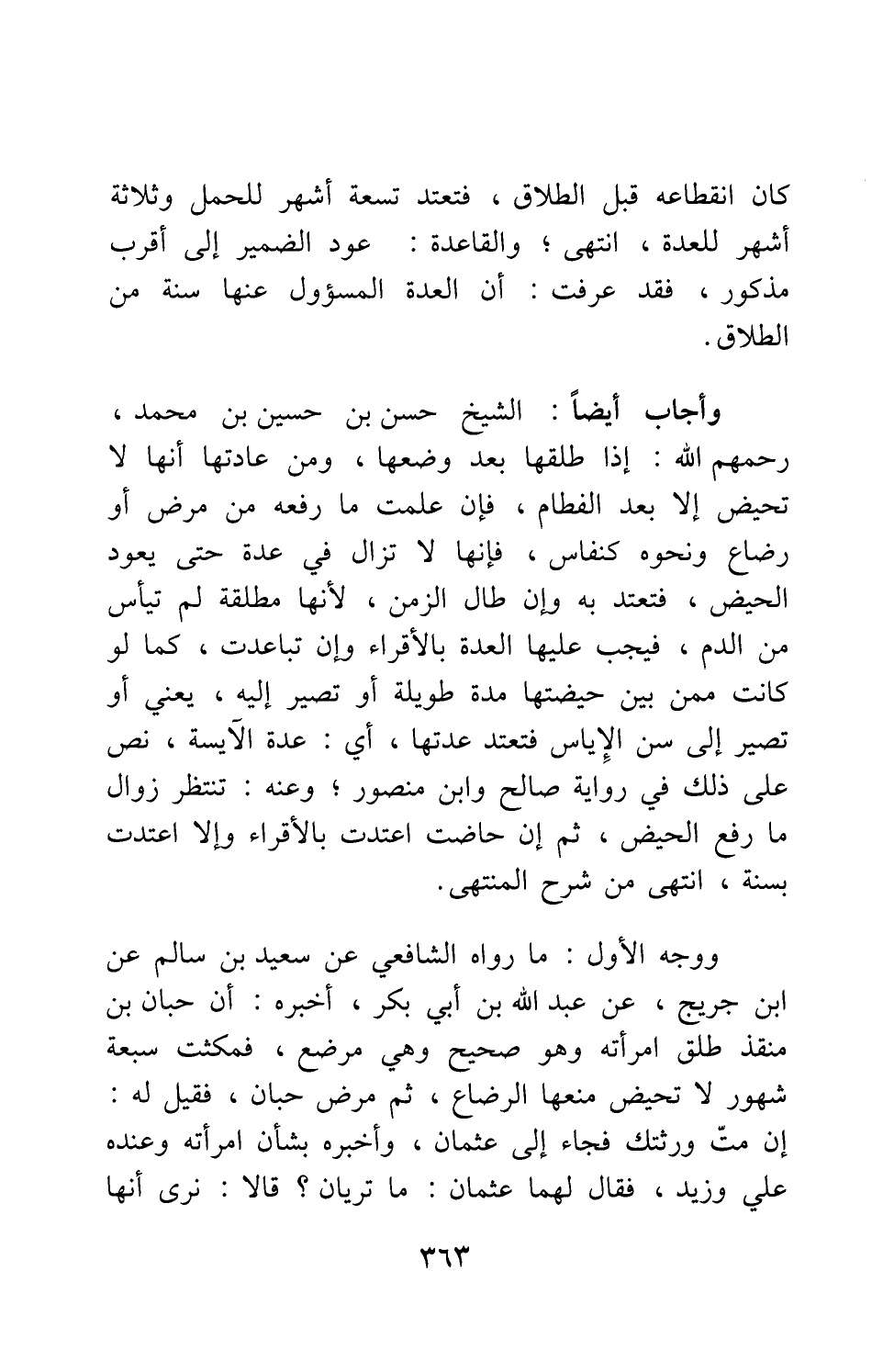 وأجاب أيضاً: الشيخ حسن بن حسين بن محمد، رحمهم الله: إذا طلقها بعد وضعها، ومن عادتها أنها لا تحيض إلا بعد الفطام، فإن علمت ما رفعه من مرض أو رضاع ونحوه كنفاس، فإنها لا تزال في عدة حتى يعود الحيض، فتعتد به وإن طال الزمن، لأنها مطلقة لم تيأس من الدم، فيجب عليها العدة بالأقراء وإن تباعدت، كما لو كانت ممن بين حيضتها مدة طويلة أو تصير إليه، يعني أو تصير إلى سن الإياس فتعتد عدتها، أي: عدة الآيسة؛ نص على ذلك في رواية صالح وابن منصور. وعنه: تنتظر زوال ما رفع الحيض، ثم إن حاضت اعتدت بالأقراء، وإلا اعتدت بسنة. انتهى من شرح المنتهى.