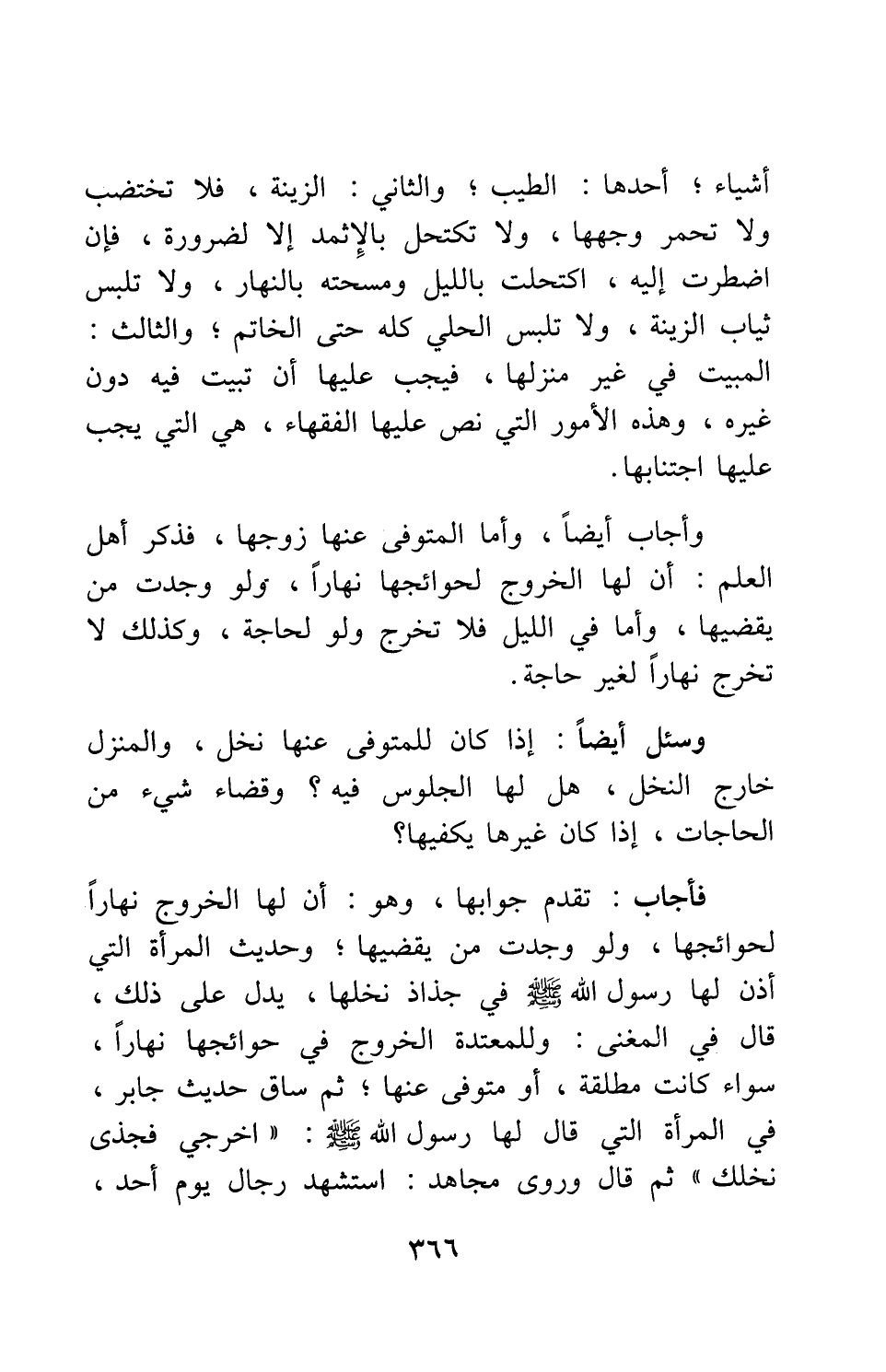 فأجاب: تقدم جوابها، وهو: أن لها الخروج نهاراً لحوائجها، ولو وجدت من يقضيها; وحديث المرأة التي أذن لها رسول الله صلى الله عليه وسلم في جذاذ نخلها، يدل على ذلك؛ قال في المغني: وللمعتدة الخروج في حوائجها نهاراً، سواء كانت مطلقة، أو متوفى عنها; ثم ساق حديث جابر في المرأة التي قال لها رسول الله صلى الله عليه وسلم: " اخرجي فجذي نخلك " 1. ثم قال: وروى مجاهد: "استشهد رجال يوم أحد،