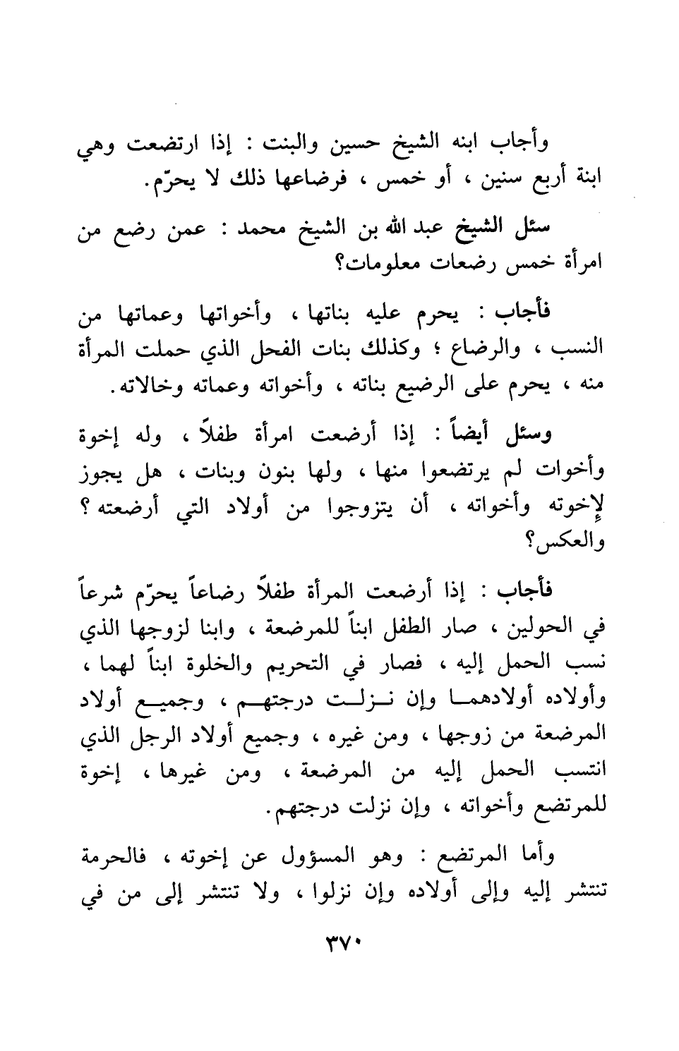 فأجاب: إذا أرضعت المرأة طفلاً رضاعاً يحرم شرعاً في الحولين، صار الطفل ابنا للمرضعة، وابنا لزوجها الذي نسب الحمل إليه، فصار في التحريم والخلوة ابناً لهما، وأولاده أولادهما وإن نزلت درجتهم، وجميع أولاد المرضعة من زوجها ومن غيره، وجميع أولاد الرجل الذي انتسب الحمل إليه من المرضعة ومن غيرها، إخوة للمرتضع وأخواته، وإن نزلت درجتهم.