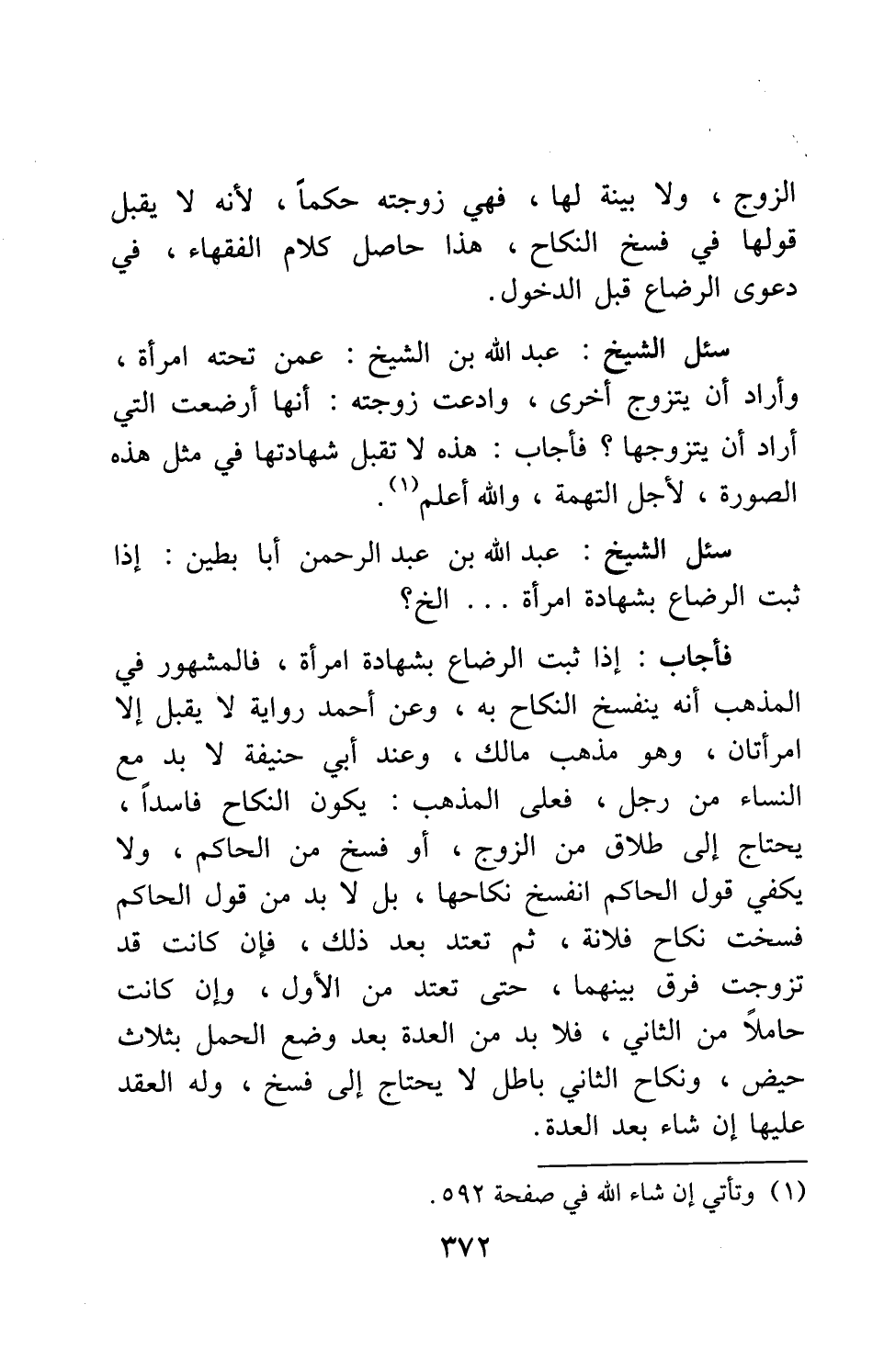 فأجاب: إذا ثبت الرضاع بشهادة امرأة، فالمشهور في المذهب أنه ينفسخ النكاح به؛ وعن أحمد رواية: لا يقبل إلا امرأتان، وهو مذهب مالك. وعند أبي حنيفة: لا بد مع النساء من رجل. فعلى المذهب: يكون النكاح فاسداً، يحتاج إلى طلاق من الزوج، أو فسخ من الحاكم، ولا يكفي قول الحاكم: انفسخ نكاحها، بل لا بد من قول الحاكم: فسخت نكاح فلانة، ثم تعتد بعد ذلك؛ فإن كانت قد تزوجت فَرّق بينهما، حتى تعتد من الأول، وإن كانت حاملاً من الثاني، فلا بد من العدة بعد وضع الحمل بثلاث حيض، ونكاح الثاني باطل لا يحتاج إلى فسخ، وله العقد عليها إن شاء بعد العدة.