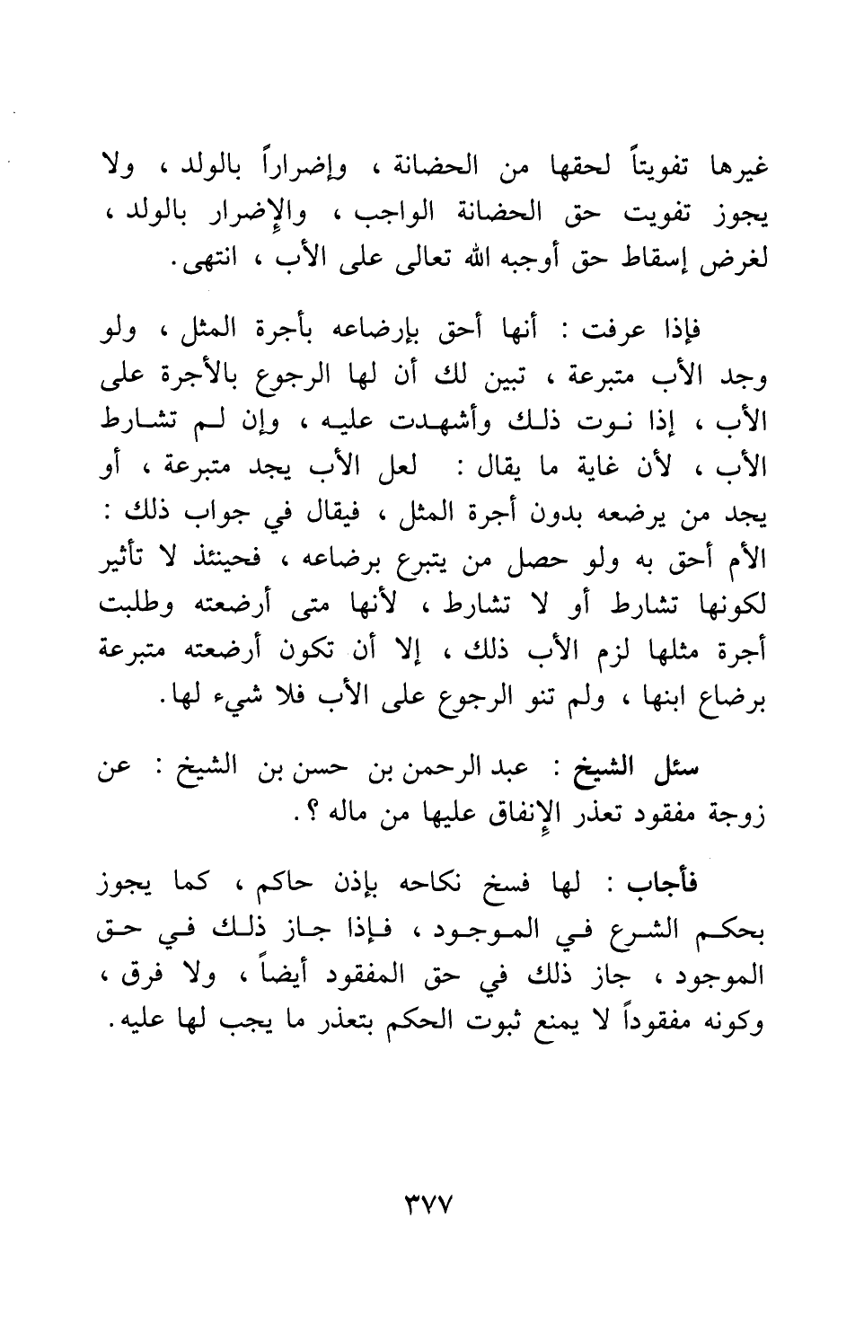 سئل الشيخ عبد الرحمن بن حسن بن الشيخ: عن زوجة مفقود تعذر الإنفاق عليها من ماله؟