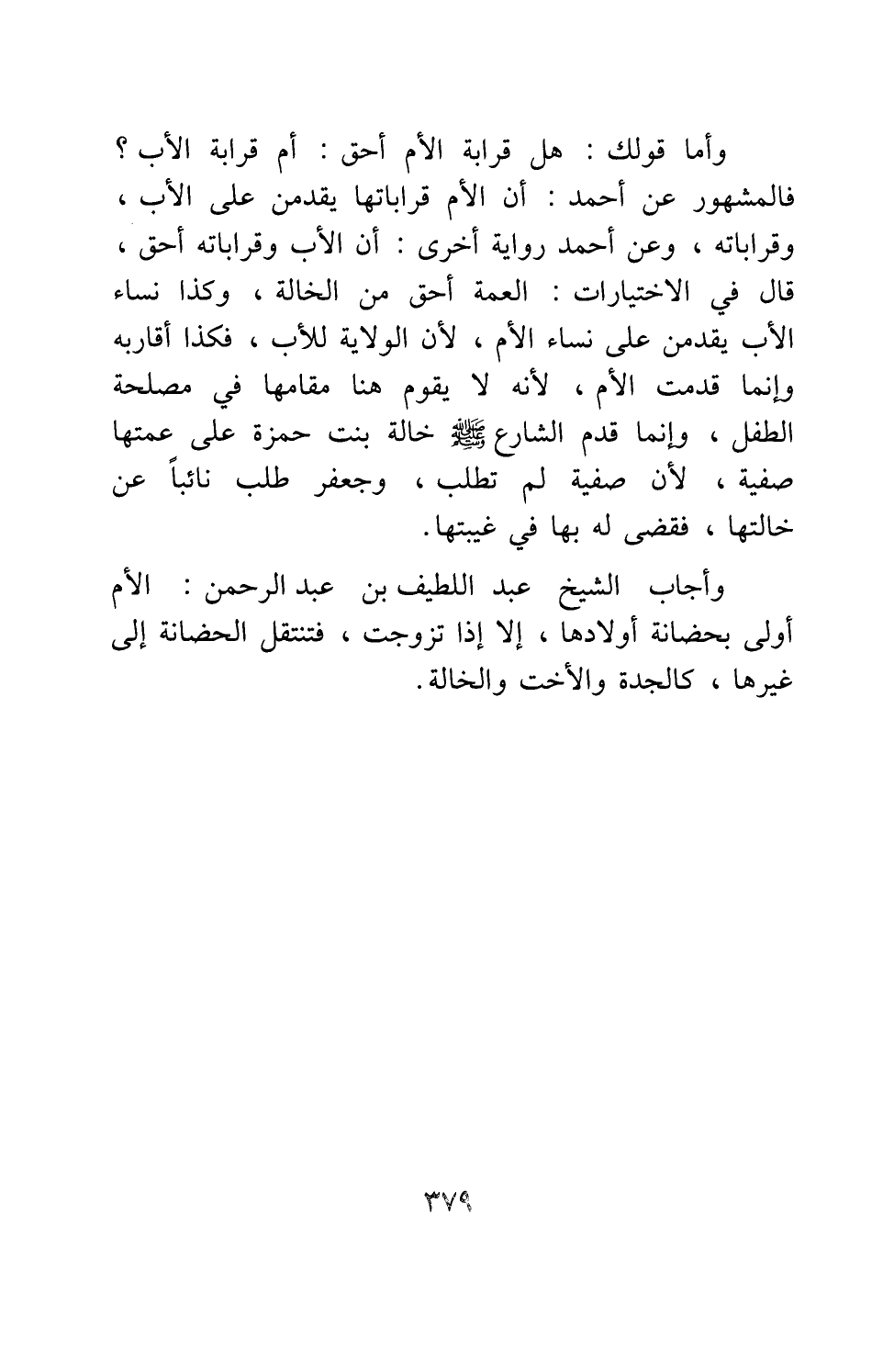 وأما قولك: هل قرابة الأم أحق، أم قرابة الأب؟ فالمشهور عن أحمد: أن الأم قراباتها يقدمن على الأب وقراباته. وعن أحمد رواية أخرى: أن الأب وقراباته أحق، قال في الاختيارات: العمة أحق من الخالة، وكذا نساء الأب يقدمن على نساء الأم، لأن الولاية للأب، فكذا أقاربه. وإنما قدمت الأم، لأنه لا يقوم هنا مقامها في مصلحة الطفل، وإنما قدم الشارع صلى الله عليه وسلم خالة بنت حمزة على عمتها صفية، لأن صفية لم تطلب، وجعفر طلب نائباً عن خالتها، فقضى له بها في غيبتها.