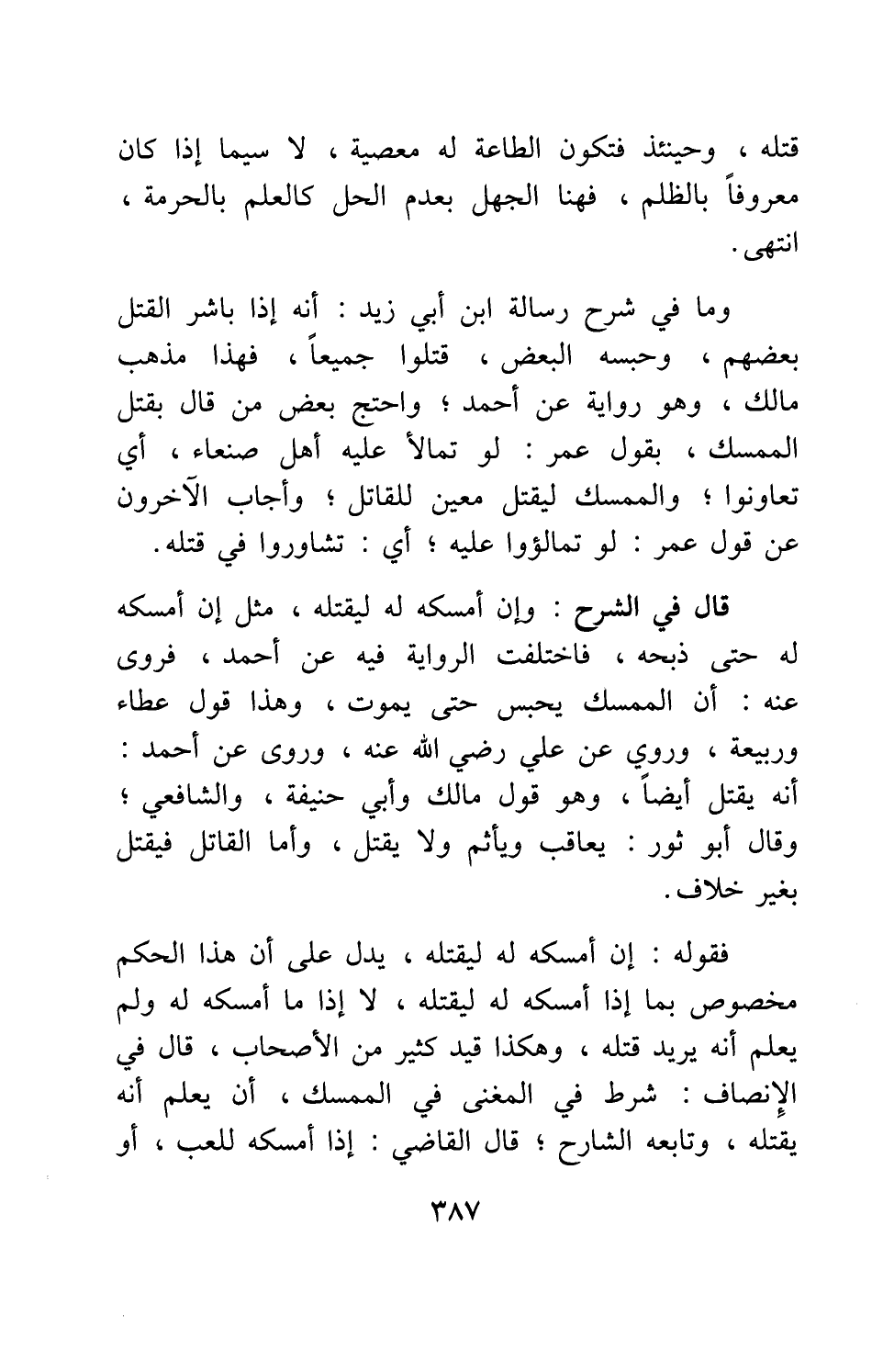 وما في شرح رسالة ابن أبي زيد: أنه إذا باشر القتل بعضهم، وحبسه البعض، قتلوا جميعاً، فهذا مذهب مالك، وهو رواية عن أحمد; واحتج بعض من قال بقتل الممسك، بقول عمر: "لو تمالأ عليه أهل صنعاء" أي: تعاونوا; والممسك ليقتل معين للقاتل. وأجاب الآخرون عن قول عمر: لو تمالؤوا عليه، أي: تشاوروا في قتله.