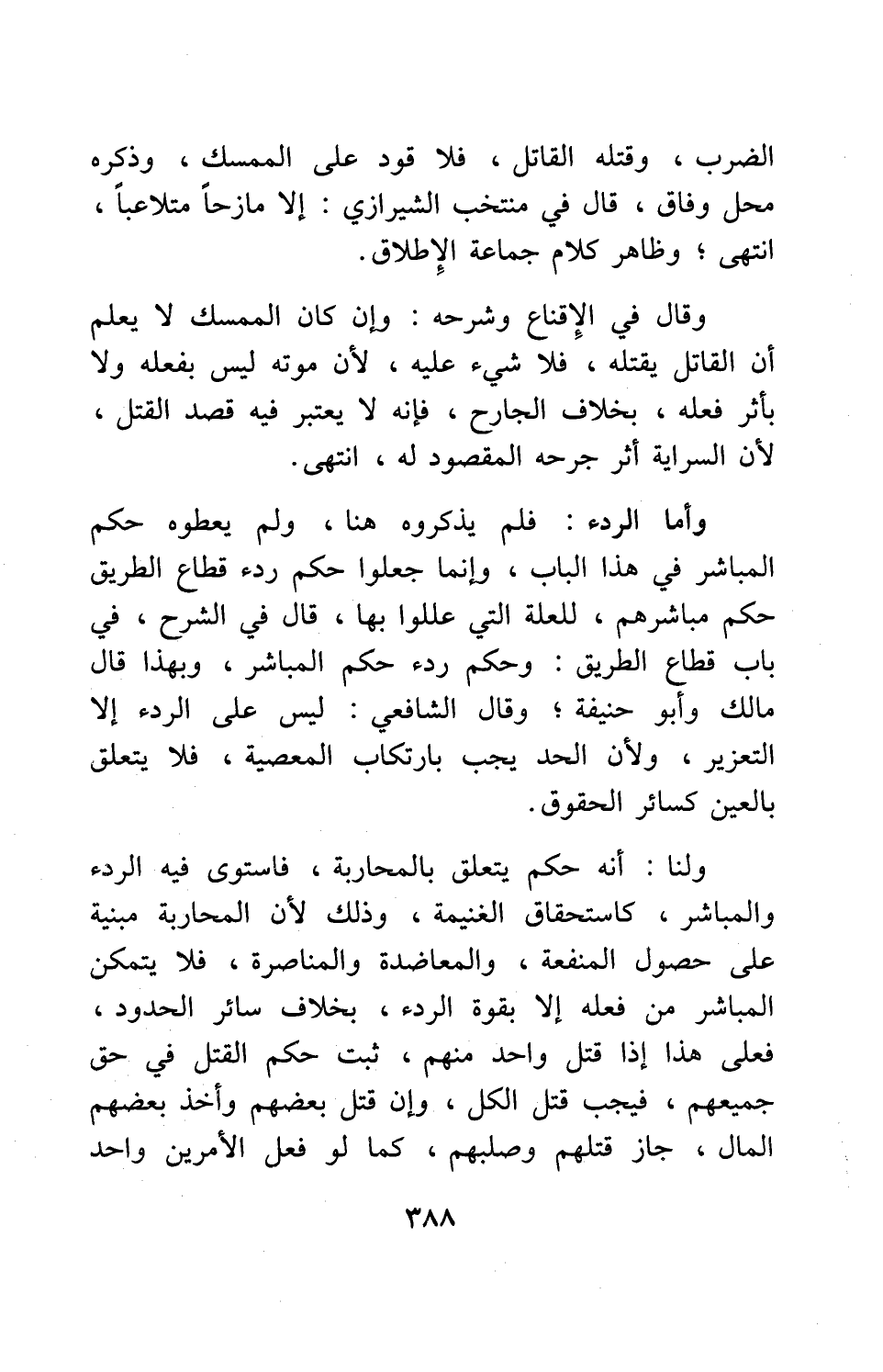 ولنا: أنه حكم يتعلق بالمحاربة، فاستوى فيه الردء والمباشر، كاستحقاق الغنيمة؛ وذلك لأن المحاربة مبنية على حصول المنفعة، والمعاضدة والمناصرة، فلا تمكن المباشر من فعله إلا بقوة الردء، بخلاف سائر الحدود. فعلى هذا، إذا قتل واحد منهم، ثبت حكم القتل في حق جميعهم، فيجب قتل الكل، وإن قتل بعضهم وأخذ بعضهم المال، جاز قتلهم وصلبهم، كما لو فعل الأمرين واحد