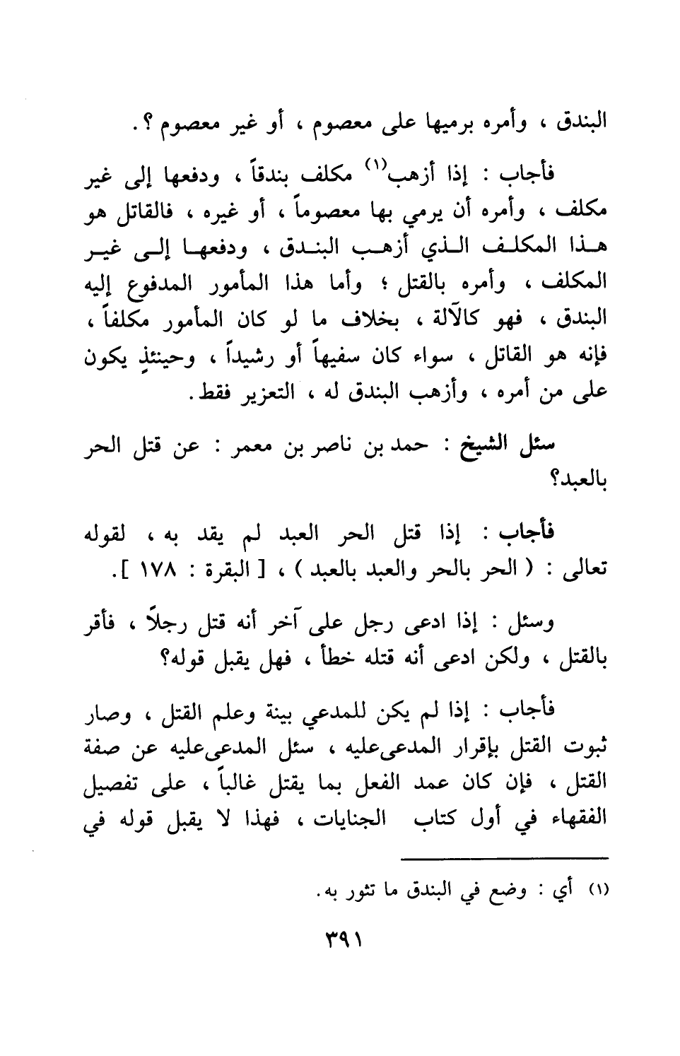 سئل الشيخ حمد بن ناصر بن معمر: عن قتل الحر بالعبد؟