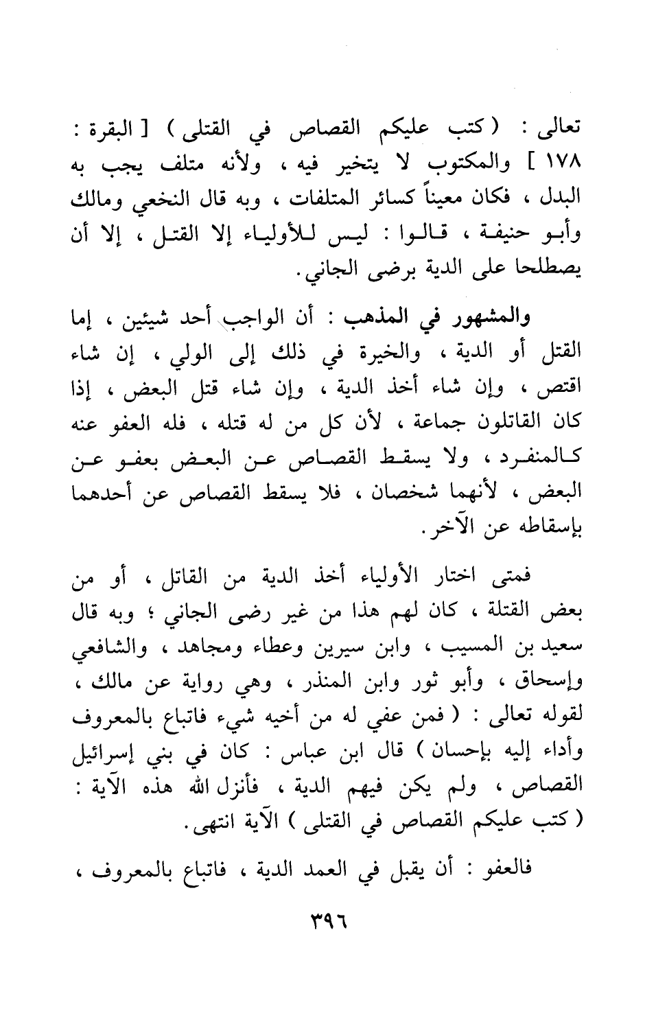 والمشهور في المذهب: أن الواجب أحد شيئين: إما القتل أو الدية، والخيرة في ذلك إلى الول:، إن شاء اقتص، وإن شاء أخذ الدية، وإن شاء قتل البعض إذا كان القاتلون جماعة، لأن كل من له قتله، فله العفو عنه كالمنفرد، ولا يسقط القصاص عن البعض بعفو عن البعض، لأنهما شخصان، فلا يسقط القصاص عن أحدهما بإسقاطه عن الآخر. فمتى اختار الأولياء أخذ الدية من القاتل، أو من بعض القتلة، كان لهم هذا من غير رضى الجاني; وبه قال سعيد بن المسيب، وابن سيرين وعطاء ومجاهد، والشافعي وإسحاق، وأبو ثور وابن المنذر، وهي رواية عن مالك، لقوله تعالى: {فَمَنْ عُفِيَ لَهُ مِنْ أَخِيهِ شَيْءٌ فَاتِّبَاعٌ بِالْمَعْرُوفِ وَأَدَاءٌ إِلَيْهِ بِإِحْسَانٍ} [سورة البقرة آية: 178] . قال ابن عباس: "كان في بني إسرائيل القصاص، ولم يكن فيهم الدية، فأنزل الله هذه الآية: {كُتِبَ عَلَيْكُمُ الْقِصَاصُ فِي الْقَتْلَى} الآية [سورة البقرة آية: 178] ?". انتهى. فالعفو: أن يقبل في العمد الدية، فاتباع بالمعروف،