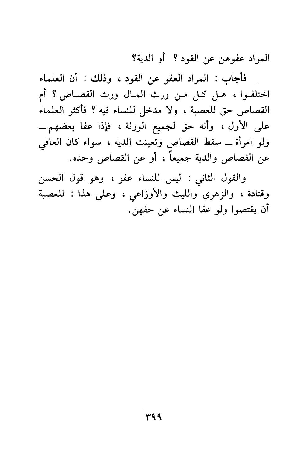 فأجاب: المراد العفو عن القود، وذلك، أن العلماء اختلفوا، هل كل من ورث المال ورث القصاص؟ أم القصاص حق للعصبة ولا مدخل للنساء فيه؟ فأكثر العلماء على الأول، وأنه حق لجميع الورثة، فإذا عفا بعضهم ولو امرأة سقط القصاص وتعينت الدية، سواء كان العافي عن القصاص والدية جميعاً، أو عن القصاص وحده.