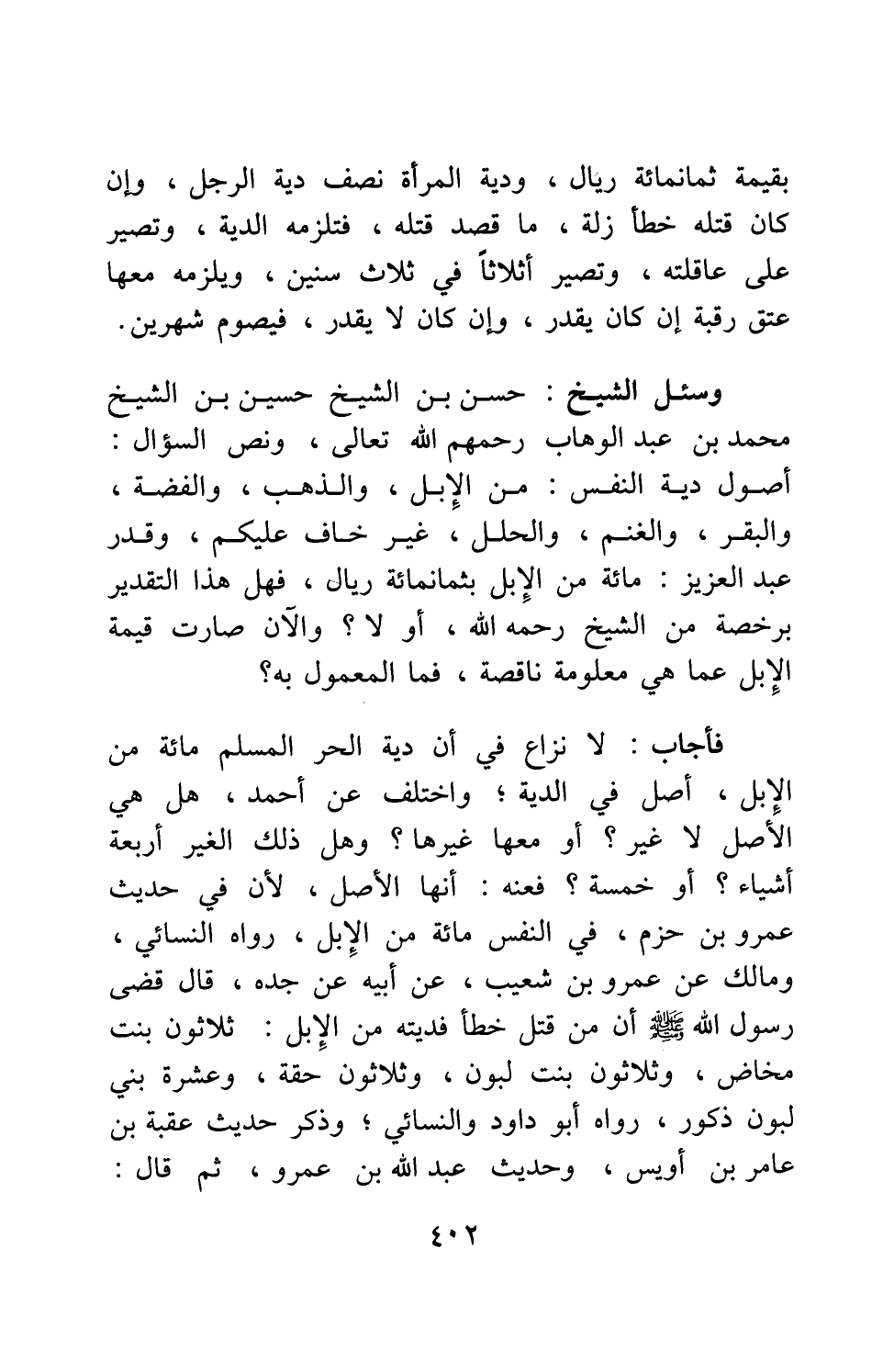 وسئل الشيخ حسن بن الشيخ حسين بن الشيخ محمد بن عبد الوهاب، رحمهم الله تعالى، ونص السؤال: أصول دية النفس من الإبل، والذهب، والفضة، والبقر، والغنم، والْحُلَل، غير خاف عليكم، وقدر عبد العزيز: مائة من الإبل بثمانمائة ريال، فهل هذا التقدير برخصة من الشيخ، رحمه الله، أو لا؟ والآن صارت قيمة الإبل عما هي معلومة ناقصة، فما المعمول به؟