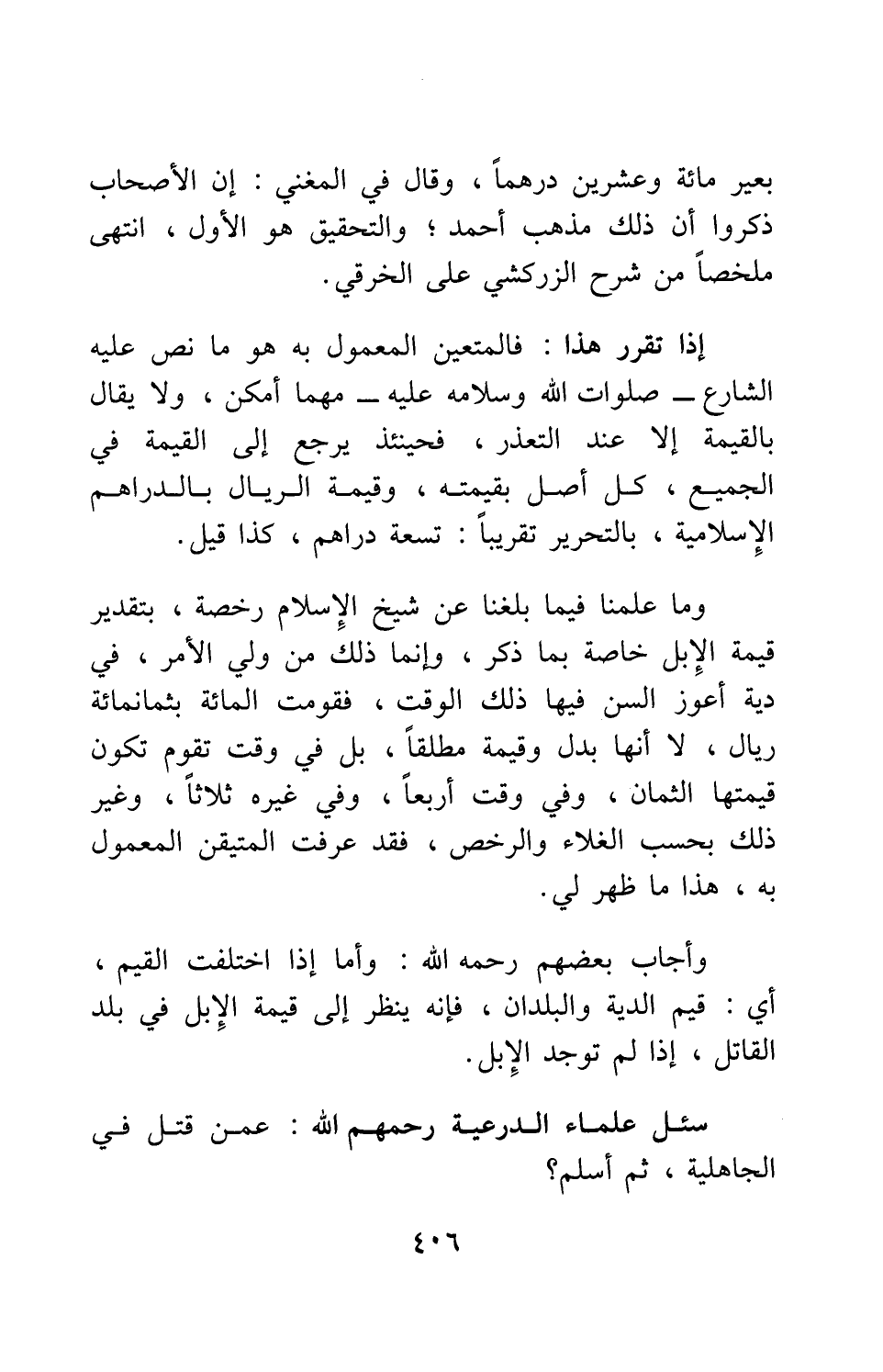 وما علمنا، فيما بلغنا عن شيخ الإسلام، رخصة بتقدير قيمة الإبل خاصة بما ذكر، وإنما ذلك من ولي الأمر، في دية أعوز السن فيها ذلك الوقت، فقومت المائة بثمانمائة ريال، لا أنها بدل وقيمة مطلقاً، بل في وقت تقوم تكون قيمتها الثمان، وفي وقت أربعاً، وفي غيره ثلاثاً، وغير ذلك بحسب الغلاء والرخص؛ فقد عرفت المتيقن المعمول به، هذا ما ظهر لي.