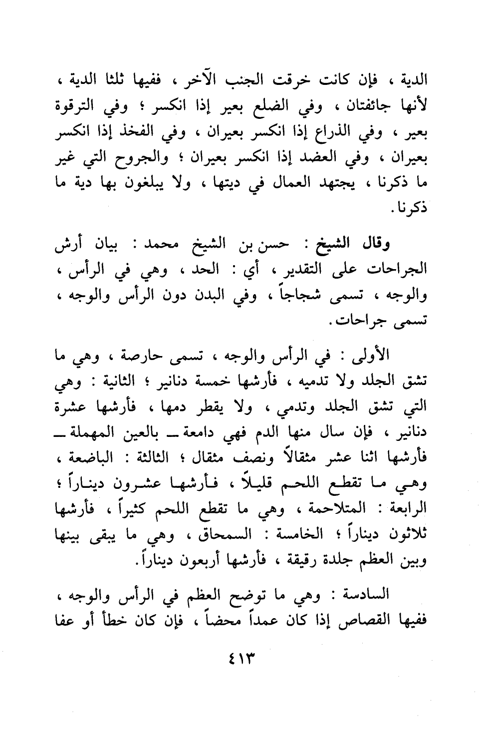 وقال الشيخ حسن بن الشيخ محمد: بيان أرش الجراحات على التقدير، أي: الحد، وهي في الرأس، والوجه، تسمى: شجاجاً، وفي البدن دون الرأس والوجه، تسمى: جراحات.
