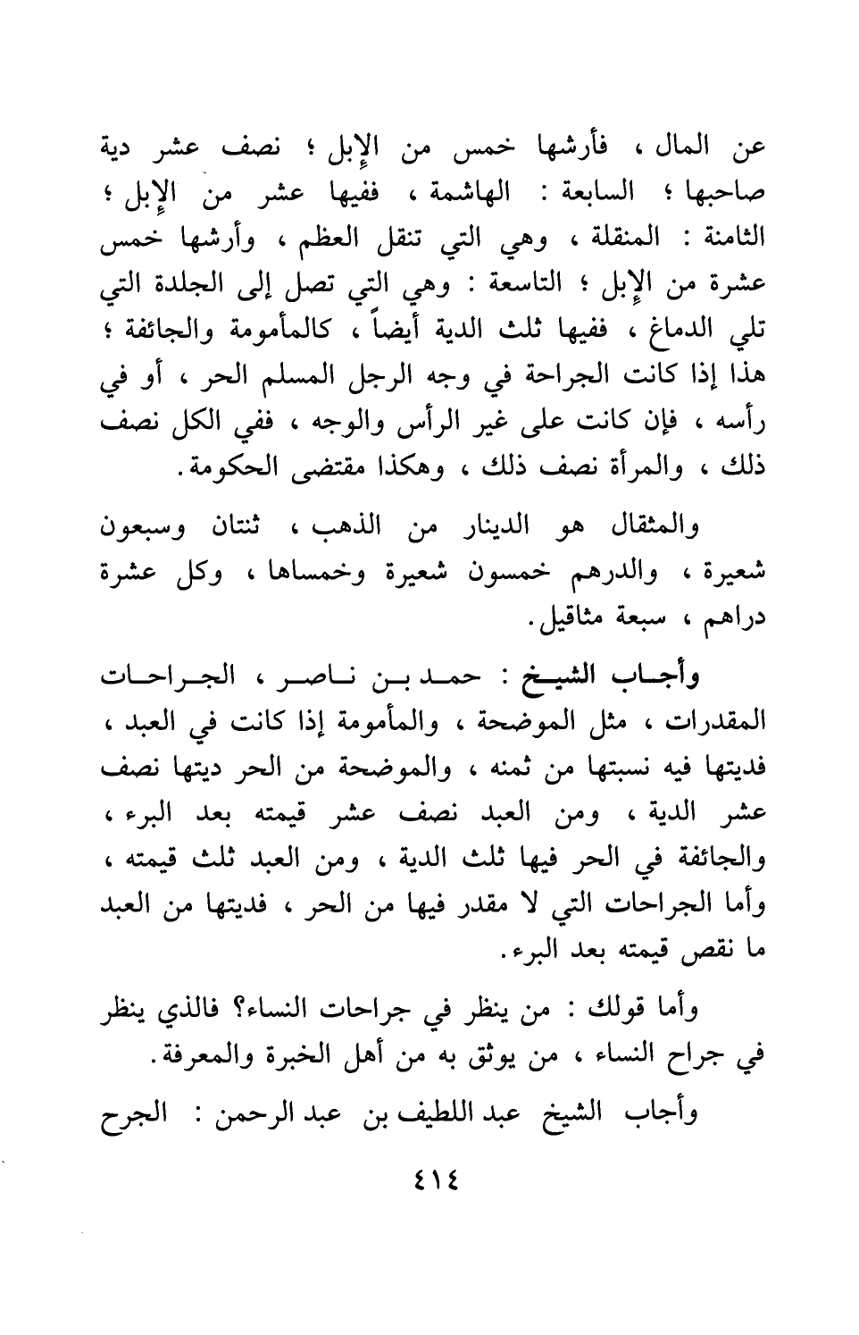 وأجاب الشيخ حمد بن ناصر: الجراحات المقدرات، مثل الموضحة، والمأمومة إذا كانت في العبد، فديتها فيه نسبتها من ثمنه، والموضحة من الحر ديتها: نصف عشر الدية، ومن العبد: نصف عشر قيمته بعد البرء، والجائفة في الحر فيها: ثلث الدية، ومن العبد: ثلث قيمته. وأما الجراحات التي لا مُقدَّر فيها من الحر، فديتها من العبد ما نقص قيمته بعد البرء.