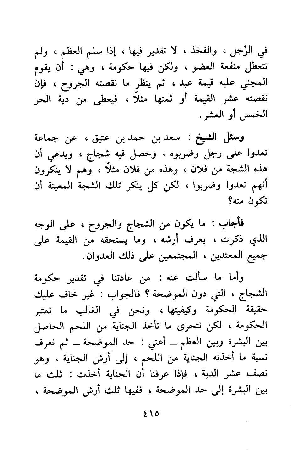 فأجاب: ما يكون من الشجاج والجروح، على الوجه الذي ذكرت، يعرف أرشه، وما يستحقه من القيمة على جميع المعتدين، المجتمعين على ذلك العدوان.