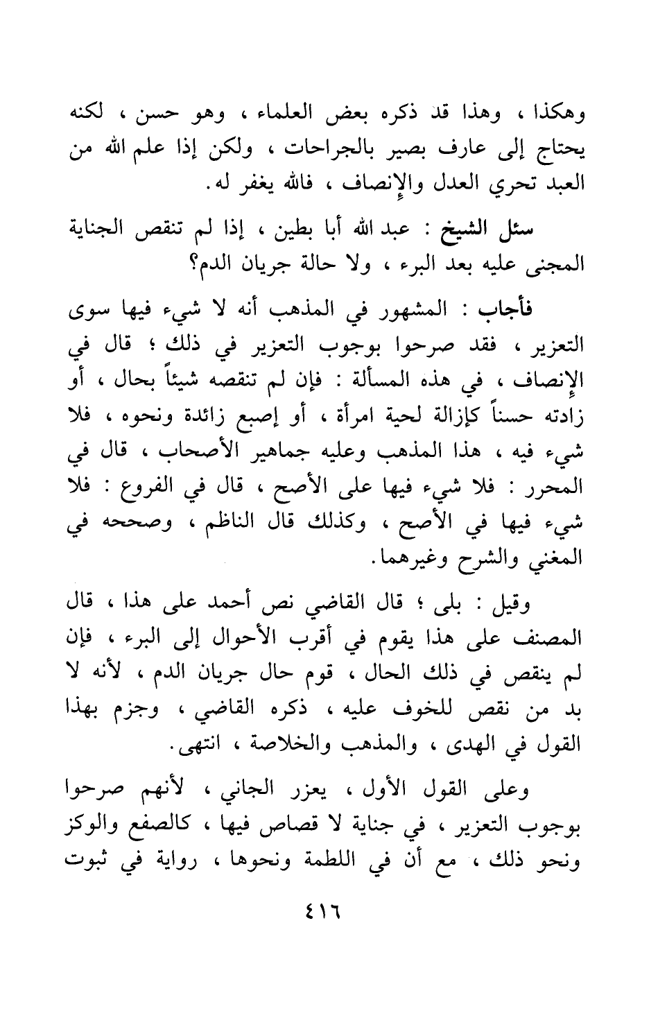 سئل الشيخ عبد الله أبا بطين: إذا لم تنقص الجناية المجني عليه بعد البرء ولا حالة جريان الدم؟