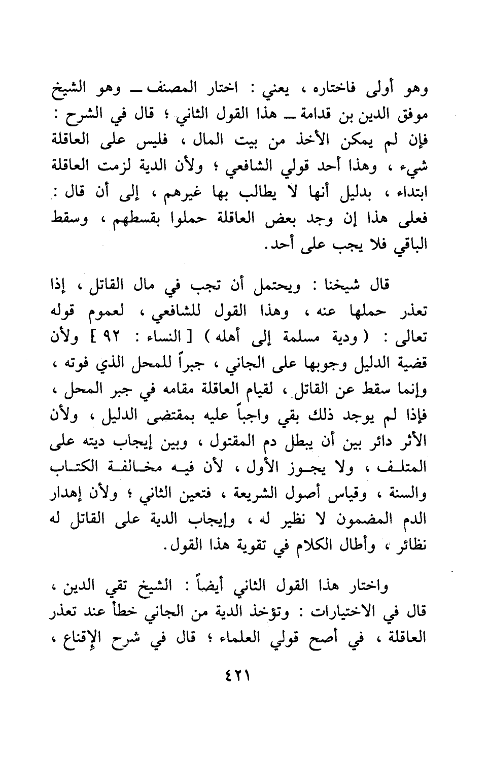 قال شيخنا: ويحتمل أن تجب في مال القاتل، إذا تعذر حملها عنه، وهذا القول للشافعي، لعموم قوله تعالى: {وَدِيَةٌ مُسَلَّمَةٌ إِلَى أَهْلِهِ} [سورة النساء آية:92] ، ولأن قضية الدليل وجوبها على الجاني، جبراً للمحل الذي فوته، وإنما سقط عن القاتل، لقيام العاقلة مقامه في جبر المحل، فإذا لم يوجد ذلك بقي واجباً عليه بمقتضى الدليل، ولأن الأثر دائر بين أن يبطل دم المقتول، وبين إيجاب ديته على المتلف، ولا يجوز الأول، لأن فيه مخالفة الكتاب والسنة، وقياس أصول الشريعة، فتعين الثاني، ولأن إهدار الدم المضمون لا نظير له، وإيجاب الدية على القاتل له نظائر؛ وأطال الكلام في تقوية هذا القول.