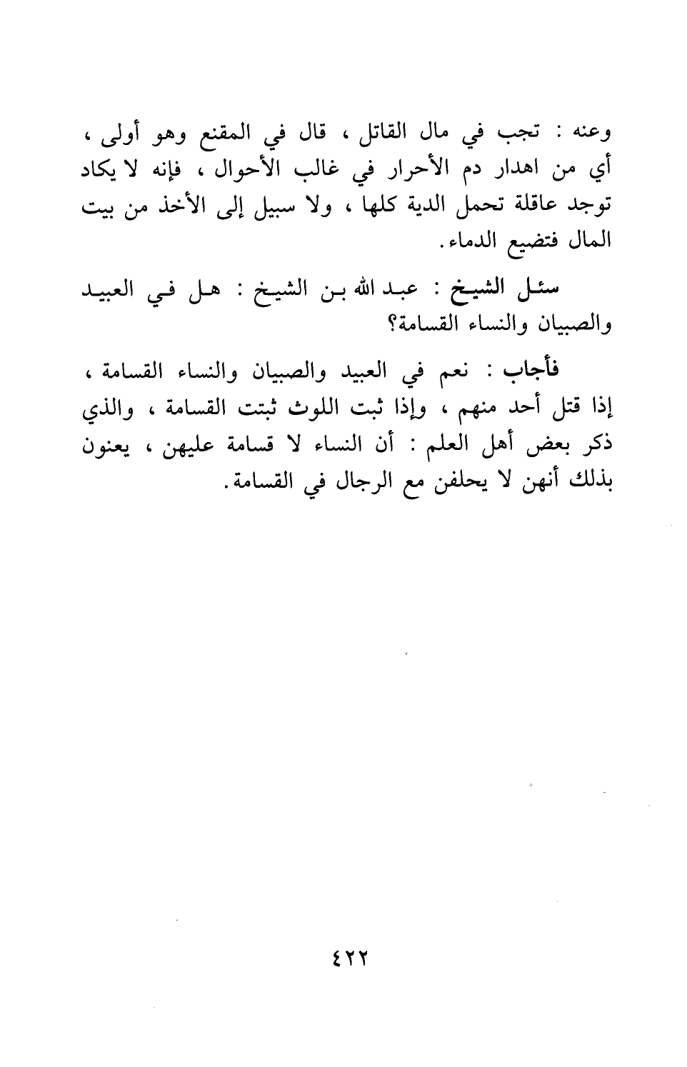 سئل الشيخ عبد الله بن الشيخ: هل في العبيد والصبيان والنساء القسامة؟