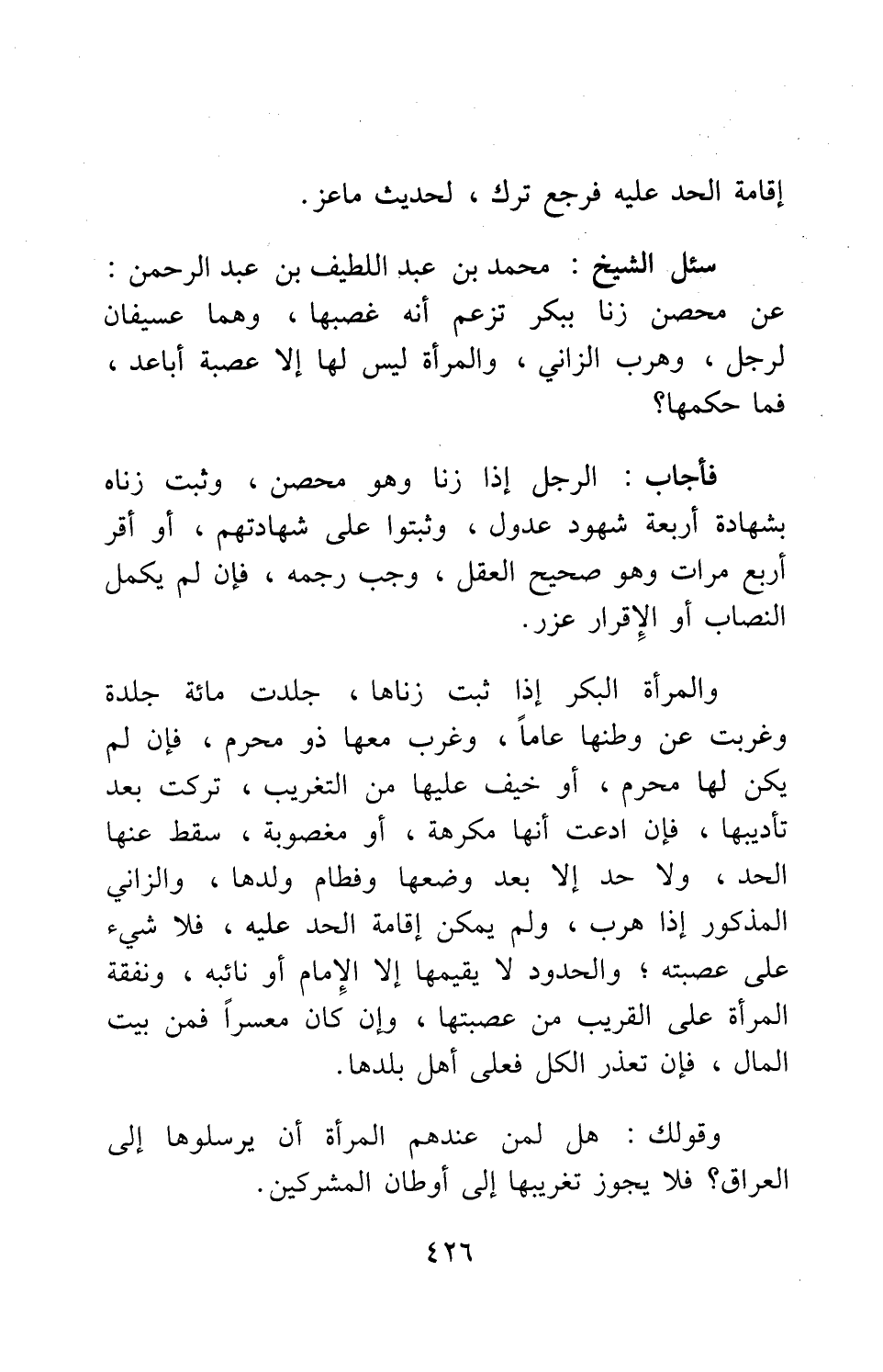 والمرأة البكر إذا ثبت زناها، جلدت مائة جلدة، وغربت عن وطنها عاماً، وغرب معها ذو محرم؛ فإن لم يكن لها محرم، أو خيف عليها من التغريب، تركت بعد تأديبها. فإن ادعت أنها مكرهة أو مغصوبة، سقط عنها الحد؛ ولا حد إلا بعد وضعها وفطام ولدها. والزاني المذكور إذا هرب، ولم يمكن إقامة الحد عليه، فلا شيء على عصبته. والحدود لا يقيمها إلا الإمام أو نائبه. ونفقة المرأة على القريب من عصبتها، وإن كان معسراً فمن بيت المال، فإن تعذر الكل فعلى أهل بلدها.