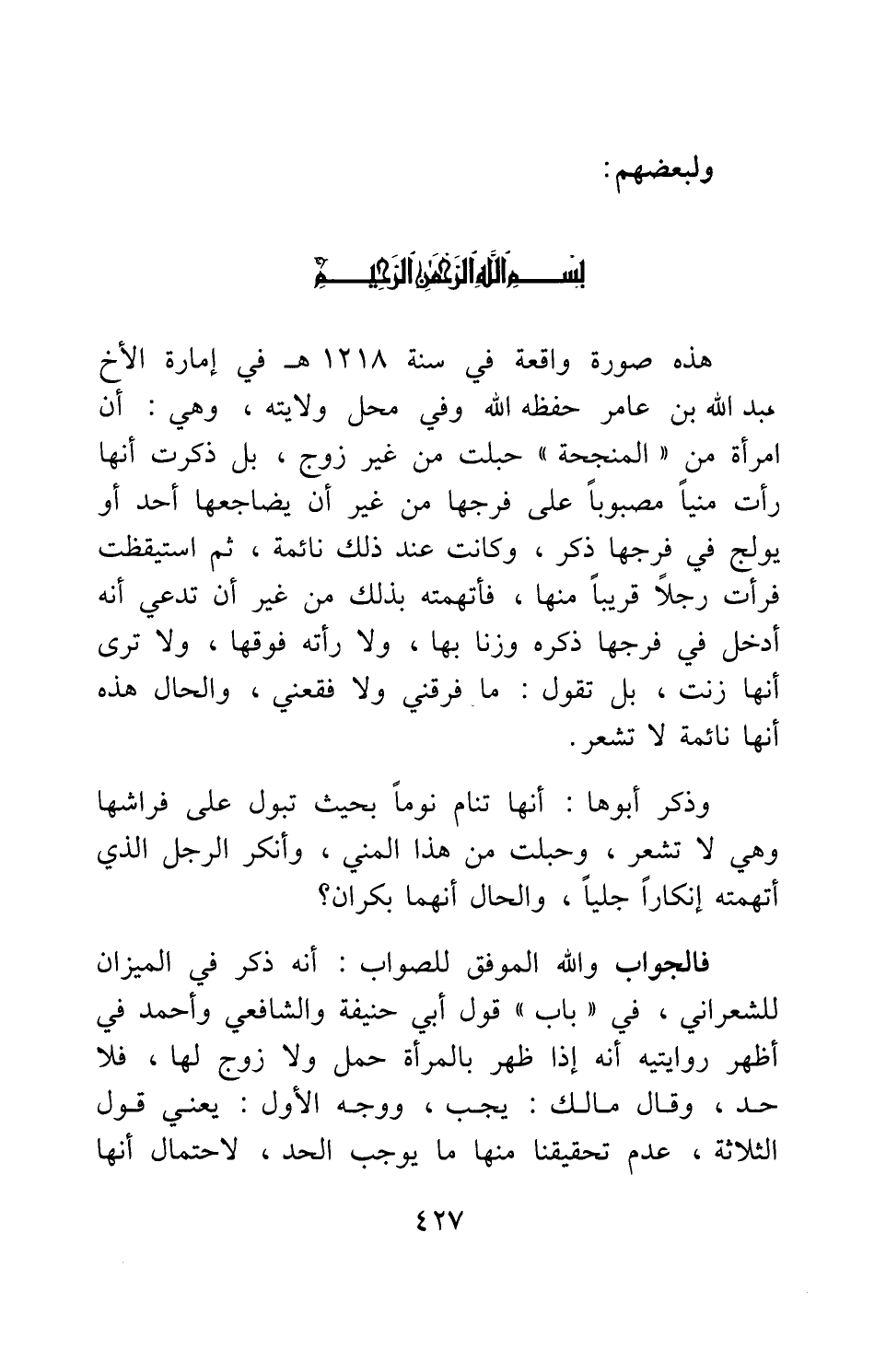 هذه صورة واقعة في سنة 1218هـ في إمارة الأخ عبد الله بن عامر، حفظه الله، وفي محل ولايته، وهي: أن امرأة من المنجحة حبلت من غير زوج، بل ذكرت أنها رأت منياً مصبوباً على فرجها من غير أن يضاجعها أحد أو يولج في فرجها ذكر، وكانت عند ذلك نائمة، ثم استيقظت فرأت رجلاً قريباً منها، فاتهمته بذلك من غير أن تدعي أنه أدخل في فرجها ذكره وزنى بها، ولا رأته فوقها، ولا ترى أنها زنت، بل تقول: ما فرقني ولا فقعني، والحال هذه أنها نائمة لا تشعر.