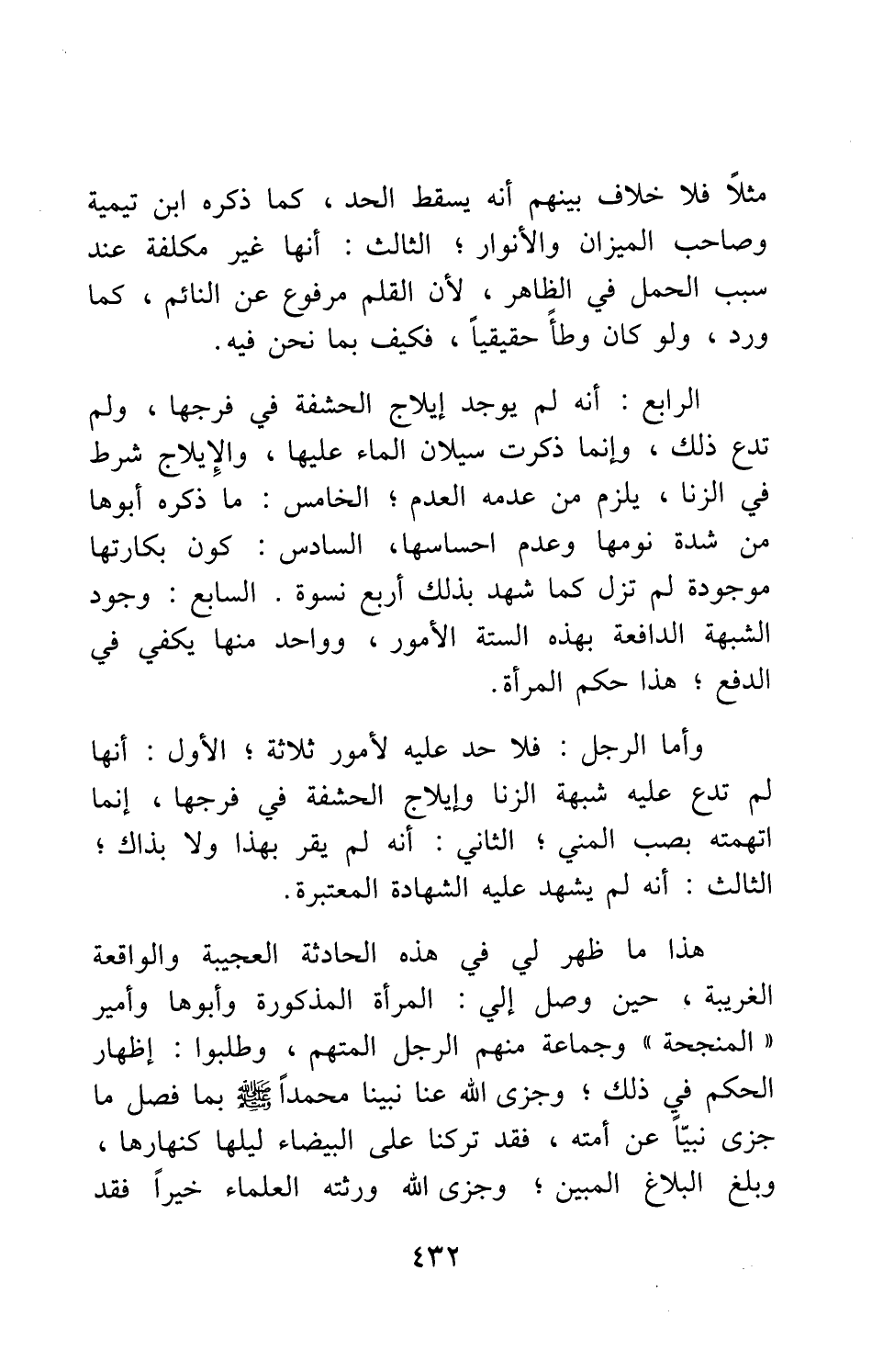 هذا ما ظهر لي في هذه الحادثة العجيبة والواقعة الغريبة، حين وصل إلي: المرأة المذكورة، وأبوها، وأمير المنجحة، وجماعة منهم الرجل المتهم، وطلبوا: إظهار الحكم في ذلك، وجزى الله عنا نبينا محمداً صلى الله عليه وسلم بما فصل ما جزى نبياً عن أمته؛ فقد تركنا على البيضاء ليلها كنهارها، وبلغ البلاغ المبين; وجزى الله ورثته العلماء خيراً فقد