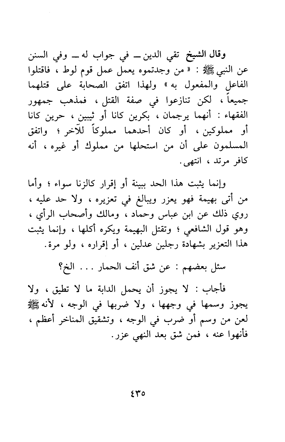 وقال الشيخ تقي الدين - في جواب له -: وفي السنن عن النبي صلى الله عليه وسلم: " من وجدتموه يعمل عمل قوم لوط، فاقتلوا الفاعل والمفعول به " 1، ولهذا اتفق الصحابة على قتلهما جميعاً، لكن تنازعوا في صفة القتل: فمذهب جمهور الفقهاء: أنهما يرجمان، بكرين كانا أو ثيبين، حرين كانا أو مملوكين، أو كان أحدهما مملوكاً للآخر; واتفق المسلمون على أن من استحلها من مملوك أو غيره، أنه كافر مرتد. انتهى. وإنما يثبت هذا الحد ببينة أو إقرار كالزنى، سواء.