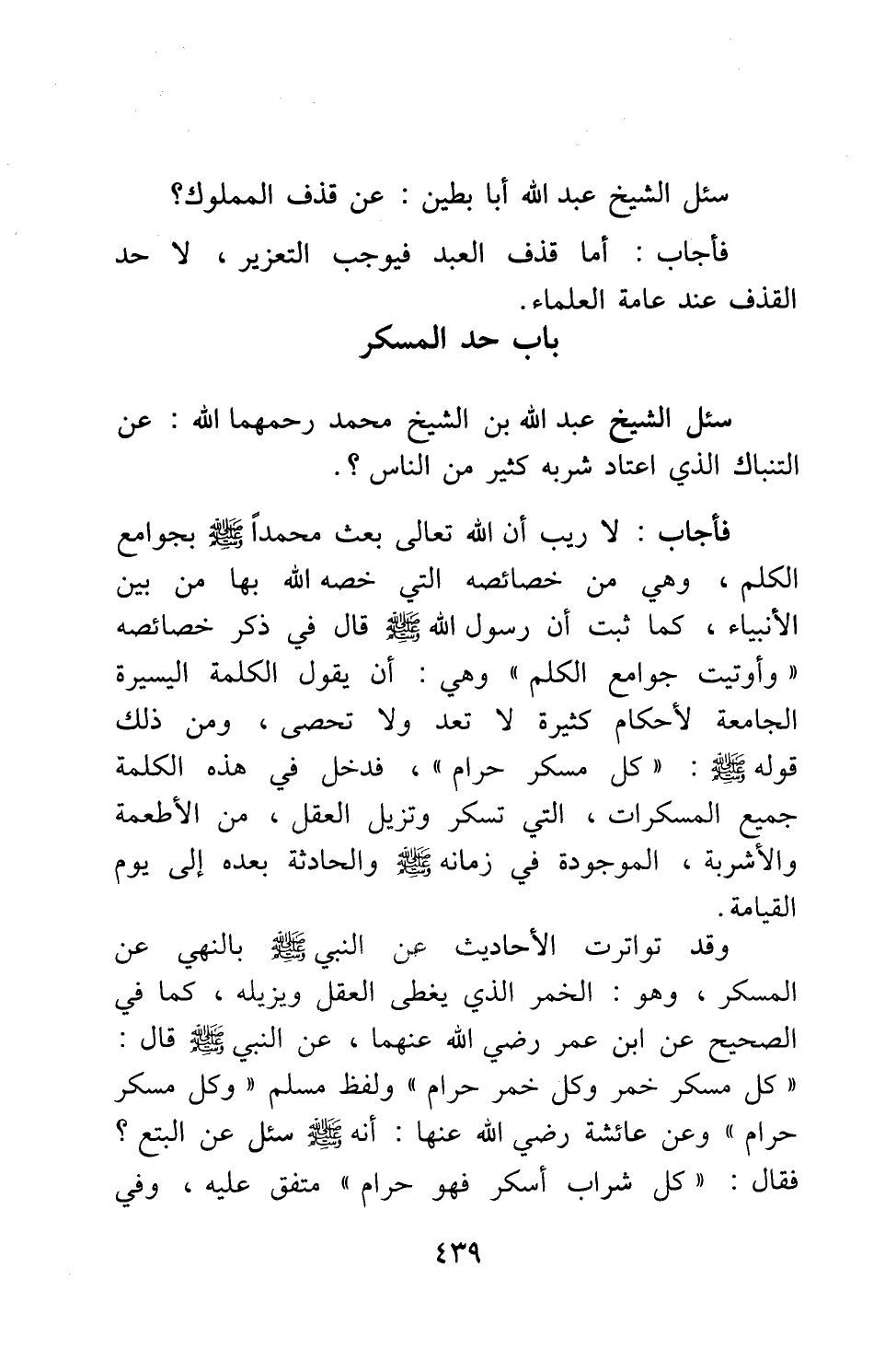 فأجاب: لا ريب أن الله تعالى بعث محمداً صلى الله عليه وسلم بجوامع الكلم، وهي من خصائصه التي خصه الله بها من بين الأنبياء، كما ثبت أن رسول الله صلى الله عليه وسلم قال في ذكر خصائصه: " وأوتيت جوامع الكلم " 1، وهي: أن يقول الكلمة اليسيرة الجامعة لأحكام كثيرة لا تعد ولا تحصى، ومن ذلك قوله صلى الله عليه وسلم: " كل مسكر حرام " 2، فدخل في هذه الكلمة جميع المسكرات، التي تسكر وتزيل العقل، من الأطعمة والأشربة الموجودة في زمانه صلى الله عليه وسلم والحادثة بعده إلى يوم القيامة.