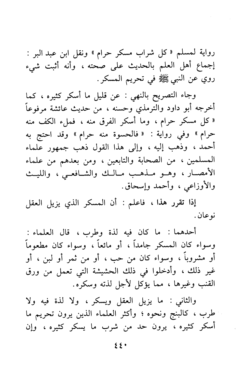 وجاء التصريح بالنهي عن قليل ما أسكر كثيرُه، كما أخرجه أبو داود والترمذي وحسنه، من حديث عائشة مرفوعاً: " كل مسكر حرام، وما أسكر الفرق منه، فملء الكف منه حرام " 2، وفي رواية: " فالحسوة منه حرام "، وقد احتج به أحمد، وذهب إليه؛ وإلى هذا القول ذهب جمهور علماء المسلمين، من الصحابة والتابعين، ومن بعدهم من علماء الأمصار، وهو مذهب مالك والشافعي، والليث والأوزاعي، وأحمد وإسحاق.
