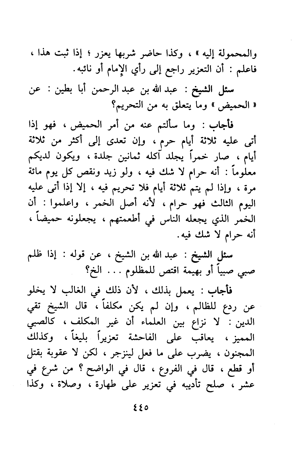 سئل الشيخ عبد الله بن الشيخ: عن قوله: إذا ظلم صبي صبياً أو بهيمة اقتص للمظلوم ... إلخ؟