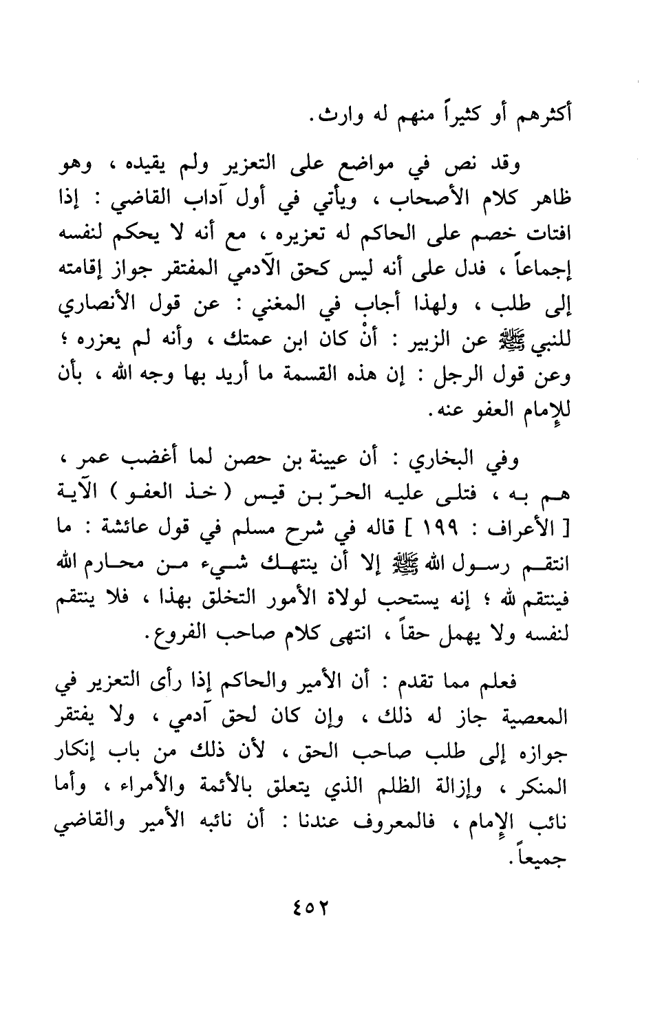 وقد نص في مواضع على التعزير ولم يقيده، وهو ظاهر كلام الأصحاب، ويأتي في أول آداب القاضي: إذا افتات خصم على الحاكم له تعزيره، مع أنه لا يحكم لنفسه إجماعاً، فدل على أنه ليس كحق الآدمي المفتقر جواز إقامته إلى طلب؛ ولهذا أجاب في المغني عن قول الأنصاري للنبي صلى الله عليه وسلم عن الزبير: أن كان ابن عمتك، وأنه لم يعزره; وعن قول الرجل: إن هذه القسمة ما أريد بها وجه الله، بأن للإمام العفو عنه.