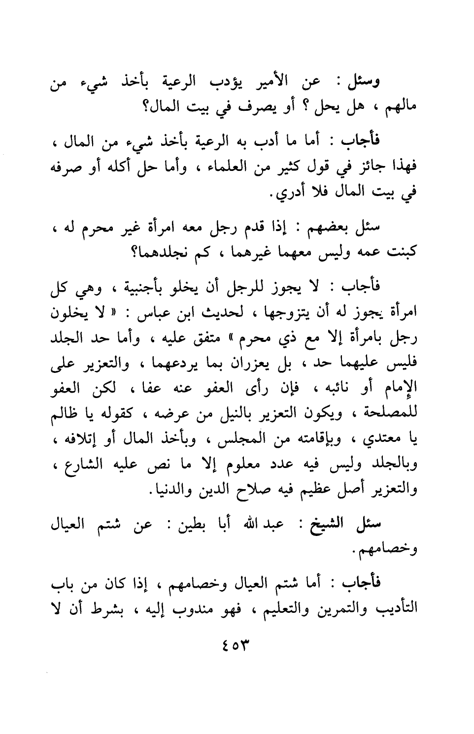 فأجاب: أما ما أدب به الرعية بأخذ شيء من المال، فهذا جائز في قول كثير من العلماء، وأما حل أكله أو صرفه في بيت المال فلا أدري.