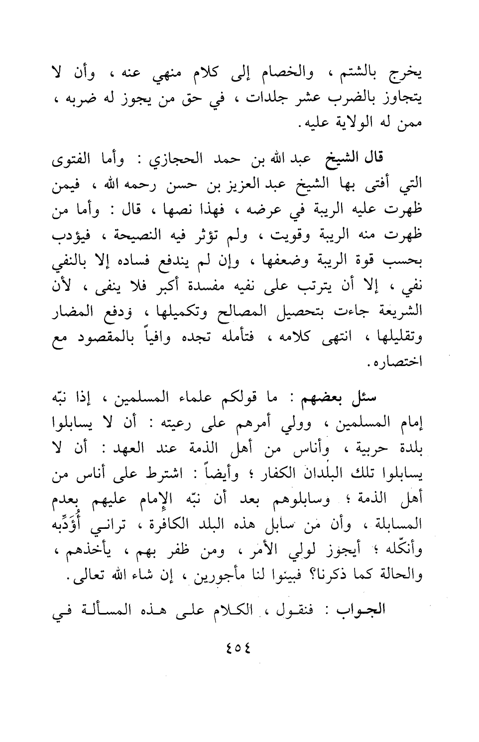 يخرج بالشتم والخصام إلى كلام منهي عنه، وأن لا يتجاوز بالضرب عشر جلدات، في حق من يجوز له ضربه، ممن له الولاية عليه. قال الشيخ عبد الله بن حمد الحجازي: وأما الفتوى التي أفتى بها الشيخ عبد العزيز بن حسن، رحمه الله، فيمن ظهرت عليه الريبة في عرضه، فهذا نصها، قال: وأما من ظهرت منه الريبة وقويت، ولم تؤثر فيه النصيحة، فيؤدب بحسب قوة الريبة وضعفها؛ وإن لم يندفع فساده إلا بالنفي نفي، إلا أن يترتب على نفيه مفسدة أكبر فلا ينفى، لأن الشريعة جاءت بتحصيل المصالح وتكميلها، ودفع المضار وتقليلها. انتهى كلامه. فتأمله تجده وافياً بالمقصود مع اختصاره.