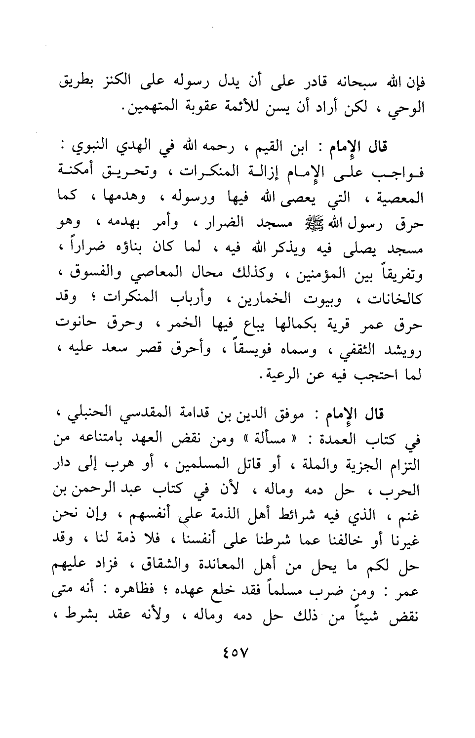 قال الإمام موفق الدين بن قدامة المقدسي الحنبلي، في كتاب العمدة: مسألة: ومن نقض العهد بامتناعه من التزام الجزية والملة، أو قاتل المسلمين، أو هرب إلى دار الحرب، حل دمه وماله، لأن في كتاب عبد الرحمن بن غنم، الذي فيه شرائط أهل الذمة على أنفسهم: وإن نحن غيرنا أو خالفنا عما شرطنا على أنفسنا، فلا ذمة لنا، وقد حل لكم ما يحل من أهل المعاندة والشقاق، فزاد عليهم عمر: "ومن ضرب مسلماً فقد خلع عهده"، فظاهره: أنه متى نقض شيئاً من ذلك حل دمه وماله، ولأنه عقد بشرط،